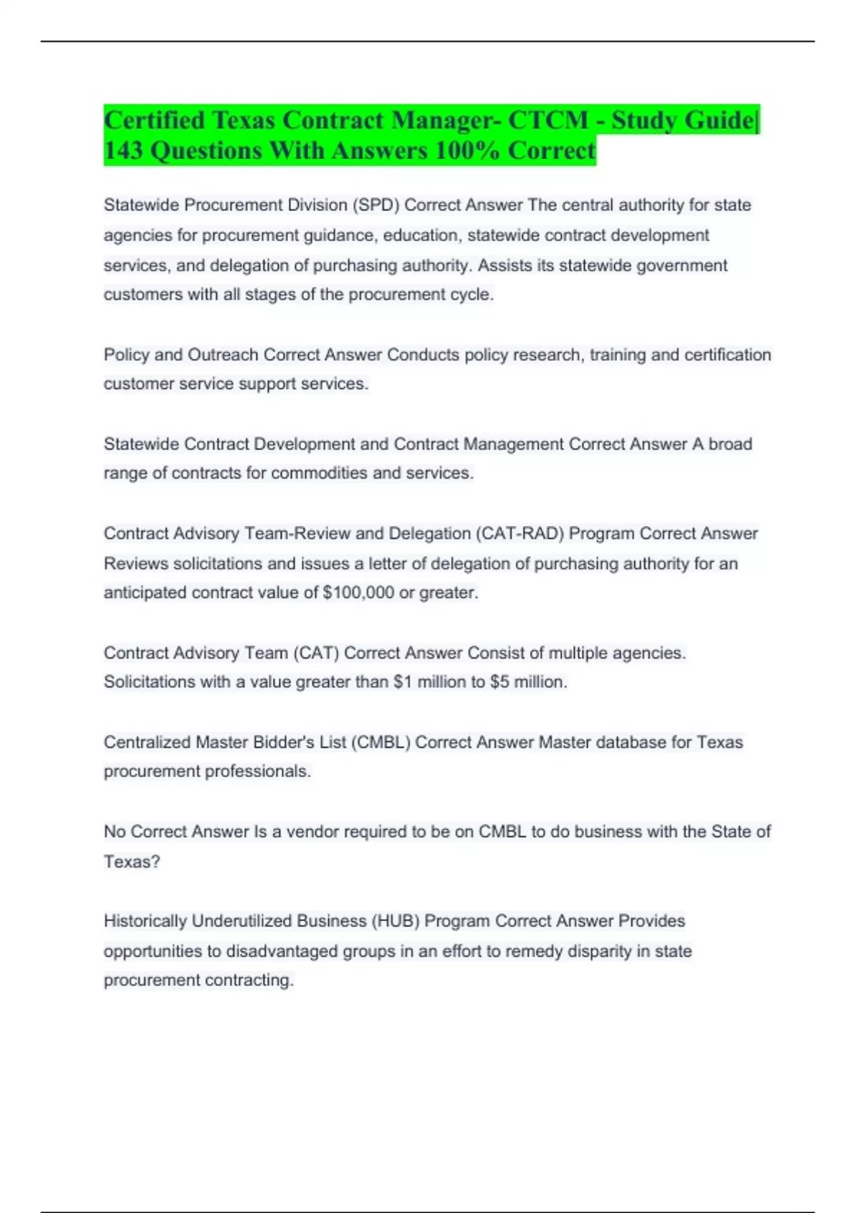 Certified Texas Contract Manager- CTCM - Study Guide|143 Questions With Answers 100% Correct Statewide Procurement Division (SPD) Correct Answer The central authority for state agencies for procurement guidance, education, statewide contract development services, and delegation of purchasing authority. Assists its statewide government customers with all stages of the procurement cycle. Policy and Outreach Correct Answer Conducts policy research, training and certification customer service support services. Statewide Contract Development and Contract Management Correct Answer A broad range of contracts for commodities and services. Contract Advisory Team-Review and Delegation (CAT-RAD) Program Correct Answer Reviews solicitations and issues a letter of delegation of purchasing authority for an anticipated contract value of $100,000 or greater. Contract Advisory Team (CAT) Correct Answer Consist of multiple agencies. Solicitations with a value greater than $1 million to $5 million. Centralized Master Bidder's List (CMBL) Correct Answer Master database for Texas procurement professionals. No Correct Answer Is a vendor required to be on CMBL to do business with the State of Texas? Historically Underutilized Business (HUB) Program Correct Answer Provides opportunities to disadvantaged groups in an effort to remedy disparity in state procurement contracting. 11.2% Correct Answer Heavy construction other than building contracts. 21.1% Correct Answer Any building construction, including general contracts and operative builders contracts.