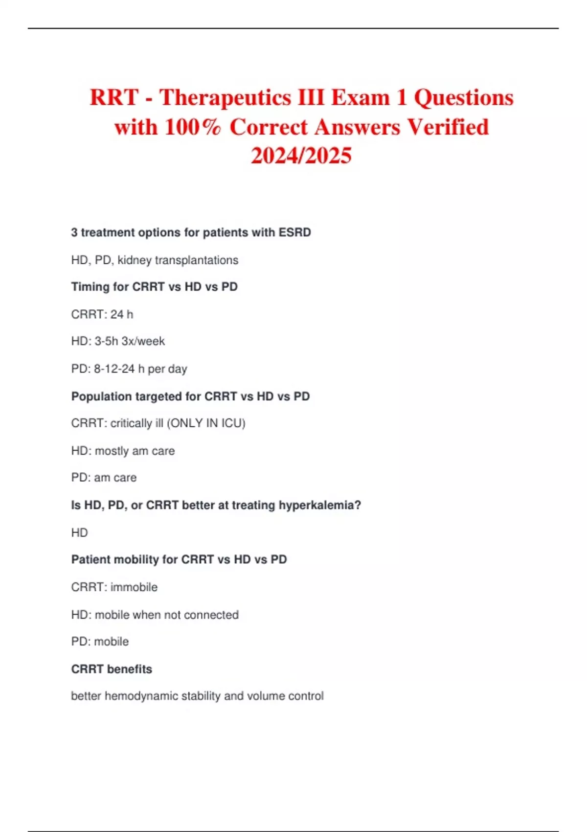 RRT - Therapeutics III Exam 1 Questions with 100% Correct Answers Verified 2024/2025 3 treatment options for patients with ESRD HD, PD, kidney transplantations Timing for CRRT vs HD vs PD CRRT: 24 h HD: 3-5h 3x/week PD: 8-12-24 h per day Population targeted for CRRT vs HD vs PD CRRT: critically ill (ONLY IN ICU) HD: mostly am care PD: am care Is HD, PD, or CRRT better at treating hyperkalemia? HD Patient mobility for CRRT vs HD vs PD CRRT: immobile HD: mobile when not connected PD: mobile CRRT benefits better hemodynamic stability and volume control HD benefits higher efficiency, low technique failure rate, early detection of underdialyssis, intermittent tx/heparin, closer pt monitoring PD benefits Improves CV stability due to slow UFR, preserves residual renal function (less stress on heart and kidneys), higher clearance of larger solutes, maintains independence, less blood loss/anemia, no heparin required, convenient route for insulin/abx CRRT risks Continuous nursing care, anticoagulant needed, increased cost, hypothermia HD risks requires multiple visits/wk, disequilibrium, increased risk of hypotension and muscle cramps, less volume control, infections related to membranes, rapid decline of residual renal function PD risks protein/AA losses, abdominal fullness = malnutrition, peritonitis risk, catheter malfunction, inadequate UF/solute clearance in larger pts, pt burnout/technique failure, obesity risk w/glucose, mechanical problems, no convenient access for IV iron 3 types of permanent access for HD AV fistula AV graft venous catheters (least desirable) goals of dialysis