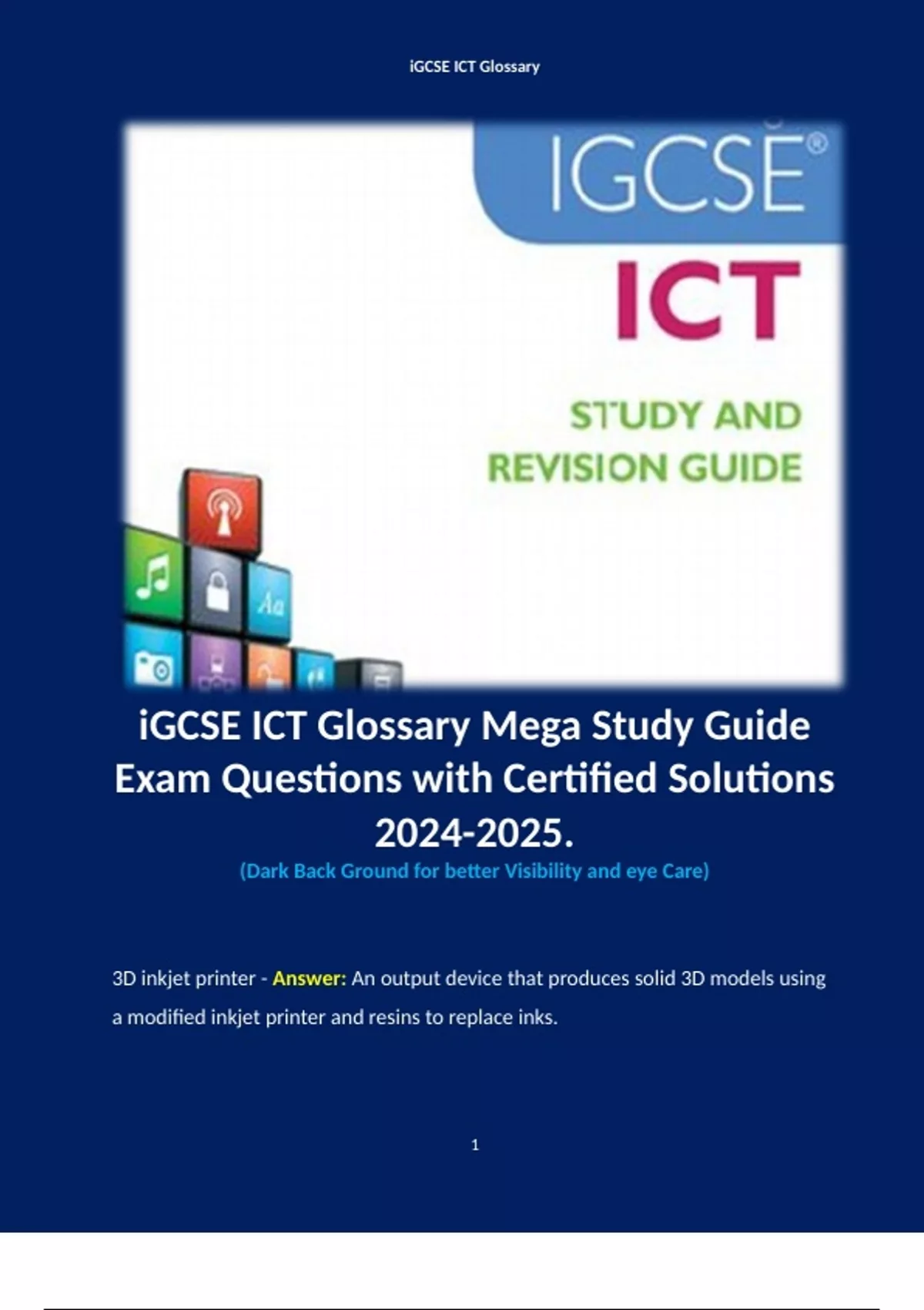 iGCSE ICT Glossary Mega Study Guide Exam Questions with Certified Solutions .