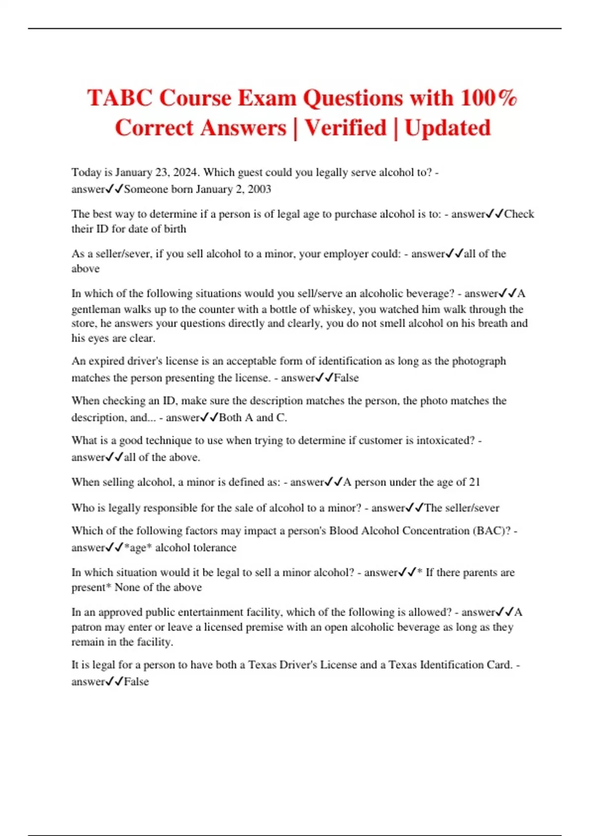 TABC Course Exam Questions with 100% Correct Answers | Verified | Updated Today is January 23, 2024. Which guest could you legally serve alcohol to? - answerSomeone born January 2, 2003 The best way to determine if a person is of legal age to purchase alcohol is to: - answerCheck their ID for date of birth As a seller/sever, if you sell alcohol to a minor, your employer could: - answerall of the above In which of the following situations would you sell/serve an alcoholic beverage? - answerA gentleman walks up to the counter with a bottle of whiskey, you watched him walk through the store, he answers your questions directly and clearly, you do not smell alcohol on his breath and his eyes are clear. An expired driver's license is an acceptable form of identification as long as the photograph matches the person presenting the license. - answerFalse When checking an ID, make sure the description matches the person, the photo matches the description, and... - answerBoth A and C. What is a good technique to use when trying to determine if customer is intoxicated? - answerall of the above. When selling alcohol, a minor is defined as: - answerA person under the age of 21 Who is legally responsible for the sale of alcohol to a minor? - answerThe seller/sever Which of the following factors may impact a person's Blood Alcohol Concentration (BAC)? - answer*age* alcohol tolerance In which situation would it be legal to sell a minor alcohol? - answer* If there parents are present* None of the above In an approved public entertainment facility, which of the following is allowed? - answerA patron may enter or leave a licensed premise with an open alcoholic beverage as long as they remain in the facility. It is legal for a person to have