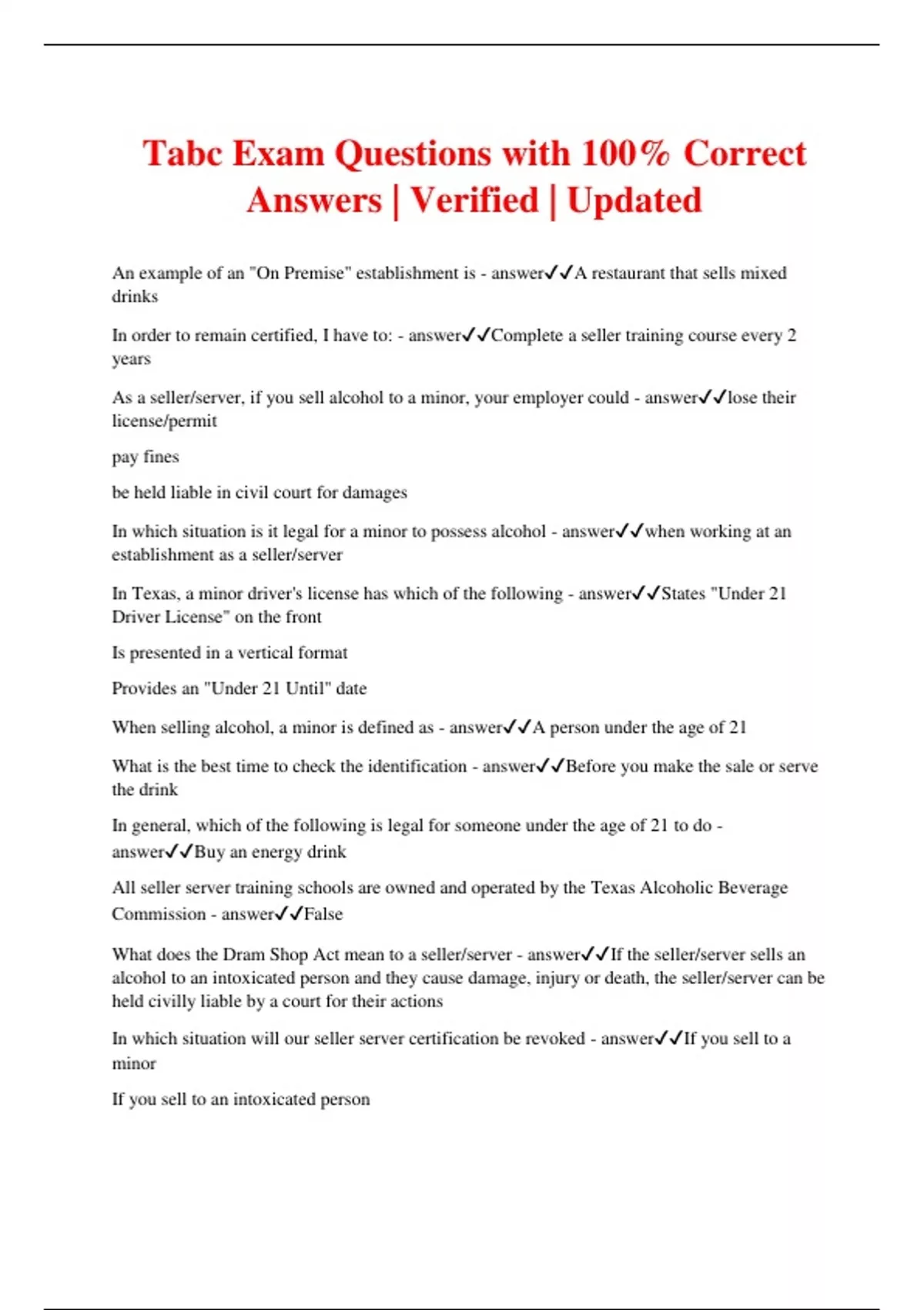Tabc Exam Questions with 100% Correct Answers | Verified | Updated An example of an "On Premise" establishment is - answerA restaurant that sells mixed drinks In order to remain certified, I have to: - answerComplete a seller training course every 2 years As a seller/server, if you sell alcohol to a minor, your employer could - answerlose their license/permit pay fines be held liable in civil court for damages In which situation is it legal for a minor to possess alcohol - answerwhen working at an establishment as a seller/server In Texas, a minor driver's license has which of the following - answerStates "Under 21 Driver License" on the front Is presented in a vertical format Provides an "Under 21 Until" date When selling alcohol, a minor is defined as - answerA person under the age of 21 What is the best time to check the identification - answerBefore you make the sale or serve the drink In general, which of the following is legal for someone under the age of 21 to do - answerBuy an energy drink