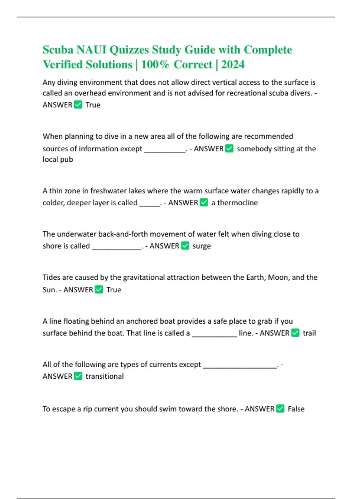 Scuba NAUI Quizzes Study Guide with Complete Verified Solutions | 100% Correct | 2024