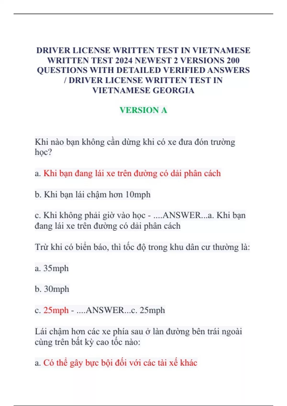 DRIVER LICENSE WRITTEN TEST IN VIETNAMESE WRITTEN TEST 2024 NEWEST 2 VERSIONS 200 QUESTIONS WITH DETAILED VERIFIED ANSWERS / DRIVER LICENSE WRITTEN TEST IN VIETNAMESE GEORGIA
