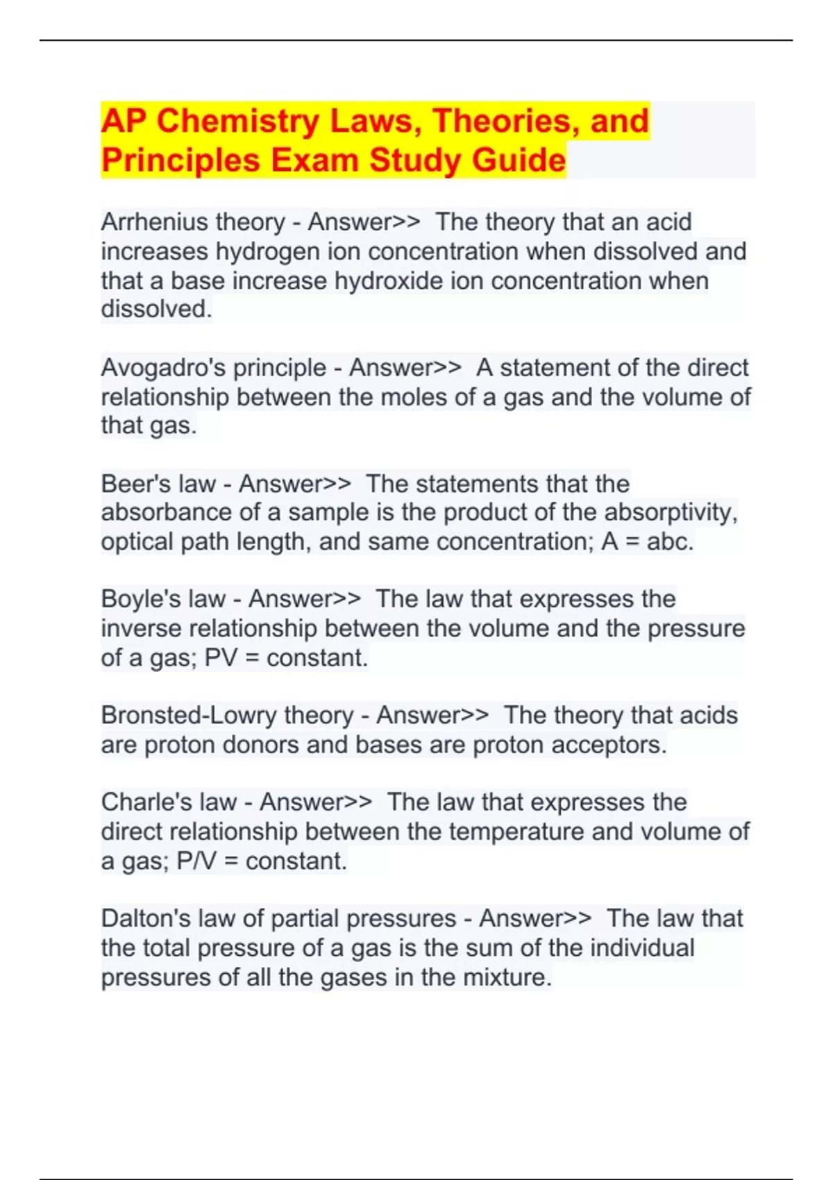 AP Chemistry Laws, Theories, and Principles Exam Study Guide Arrhenius theory - Answer>> The theory that an acid increases hydrogen ion concentration when dissolved and that a base increase hydroxide ion concentration when dissolved. Avogadro's principle - Answer>> A statement of the direct relationship between the moles of a gas and the volume of that gas.