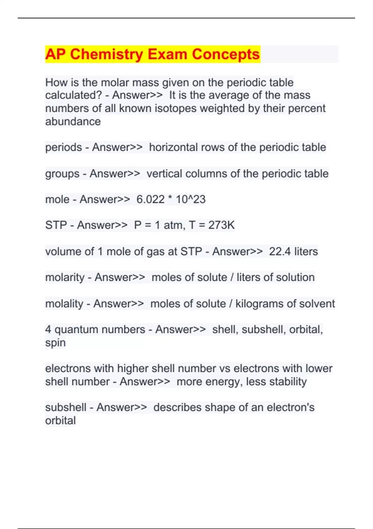 AP Chemistry Exam Concepts How is the molar mass given on the periodic table calculated? - Answer>> It is the average of the mass numbers of all known isotopes weighted by their percent abundance periods - Answer>> horizontal rows of the periodic table groups - Answer>> vertical columns of the periodic table mole - Answer>> 6.022 * 10^23