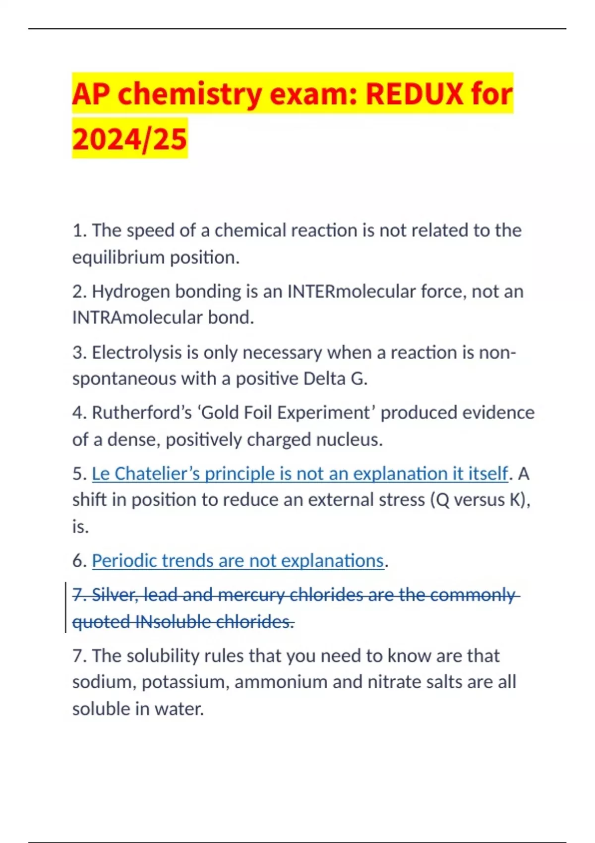 AP chemistry exam: REDUX for 2024/25 1. The speed of a chemical reaction is not related to the equilibrium position. 2. Hydrogen bonding is an INTERmolecular force, not an INTRAmolecular bond. 3. Electrolysis is only necessary when a reaction is non-spontaneous with a positive Delta G. 4. Rutherford’s ‘Gold Foil Experiment’ produced evidence of a dense, positively charged nucleus. 5. Le Chatelier’s principle is not an explanation it itself. A shift in position to reduce an external stress (Q versus K), is.