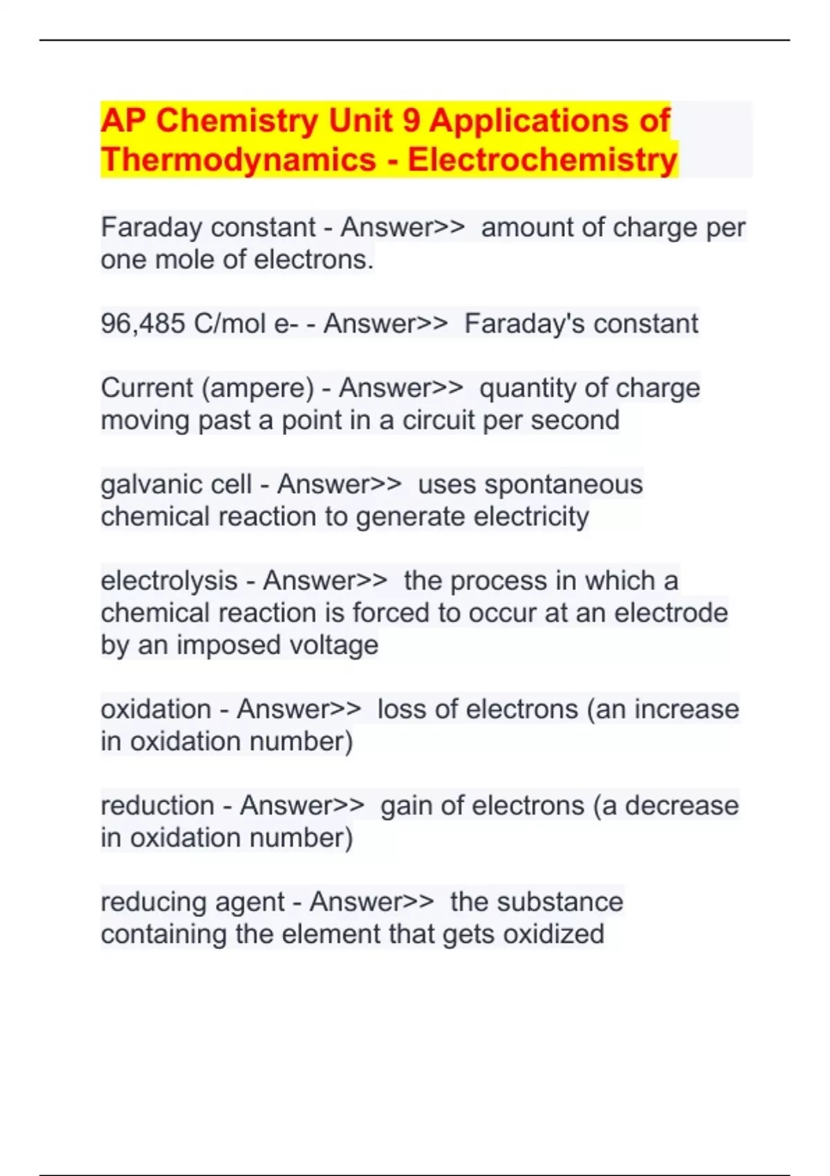 AP Chemistry Unit 9 Applications of Thermodynamics - Electrochemistry Faraday constant - Answer>> amount of charge per one mole of electrons. 96,485 C/mol e- - Answer>> Faraday's constant Current (ampere) - Answer>> quantity of charge moving past a point in a circuit per second galvanic cell - Answer>> uses spontaneous chemical reaction to generate electricity