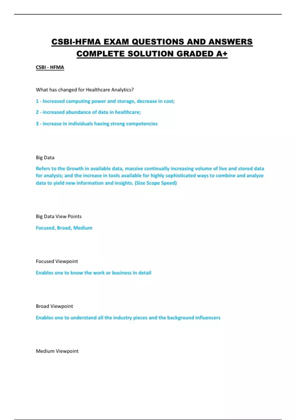 CSBI-HFMA EXAM QUESTIONS AND ANSWERS COMPLETE SOLUTION GRADED A+ CSBI-HFMA EXAM QUESTIONS AND ANSWERS COMPLETE SOLUTION GRADED A+ CSBI - HFMA What has changed for Healthcare Analytics? 1 - Increased computing power and storage, decrease in cost; 2 - increased abundance of data in healthcare; 3 - increase in individuals having strong competencies Big Data Refers to the Growth in available data, massive continually increasing volume of live and stored data for analysis; and the increase in tools available for highly sophisticated ways to combine and analyze data to yield new information and insights. (Size Scope Speed) Big Data View Points Focused, Broad, Medium Focused Viewpoint Enables one to know the work or business in detail Broad Viewpoint Enables one to understand all the industry pieces and the background influencers Medium Viewpoint