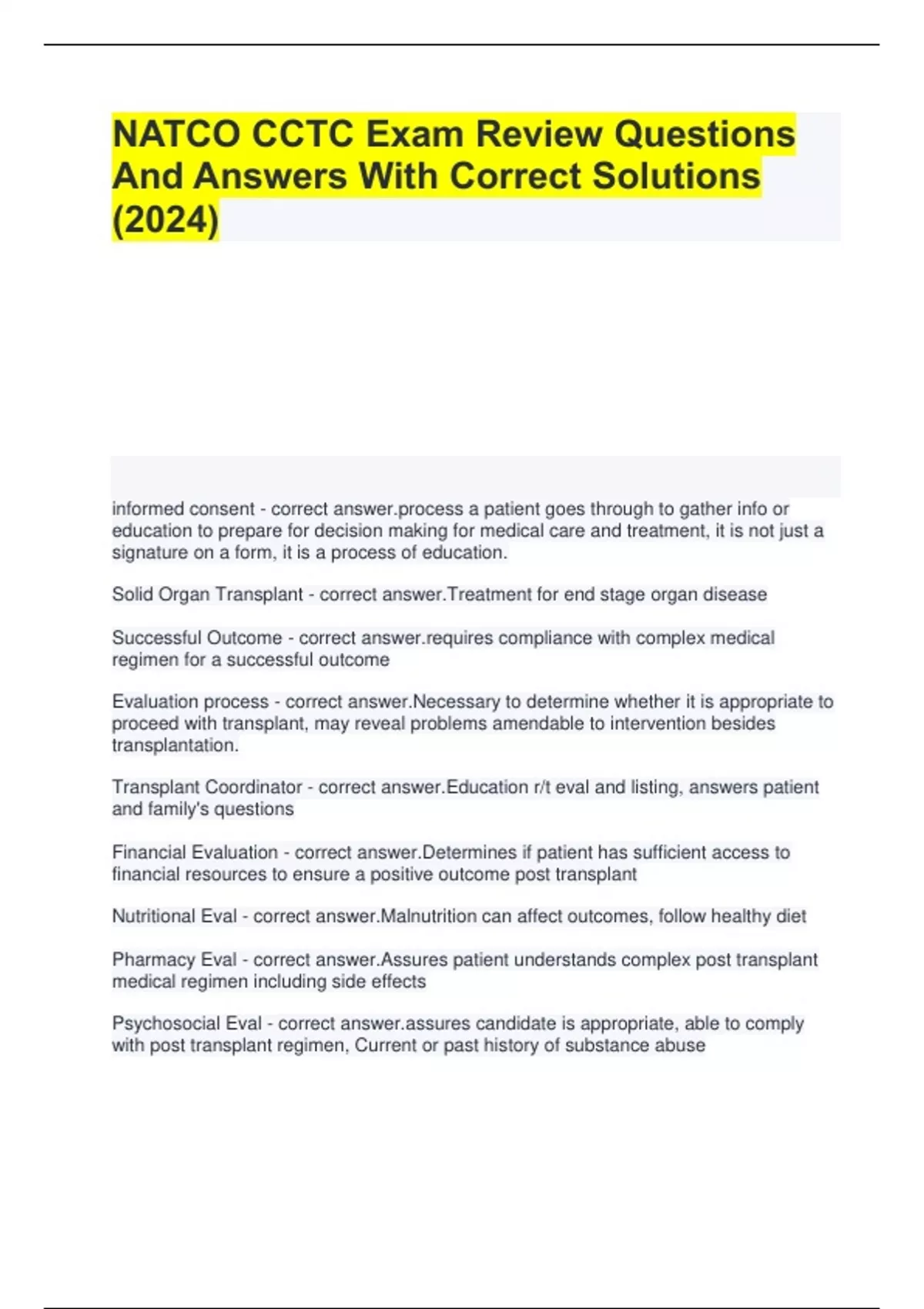 NATCO CCTC Exam Review Questions And Answers With Correct Solutions (2024) informed consent - correct ss a patient goes through to gather info or education to prepare for decision making for medical care and treatment, it is not just a signature on a form, it is a process of education. Solid Organ Transplant - correct answer.Treatment for end stage organ disease Successful Outcome - correct res compliance with complex medical regimen for a successful outcome Evaluation process - correct answer.Necessary to determine whether it is appropriate to proceed with transplant, may reveal problems amendable to intervention besides transplantation. Transplant Coordinator - correct answer.Education r/t eval and listing, answers patient and family's questions Financial Evaluation - correct answer.Determines if patient has sufficient access to financial resources to ensure a positive outcome post transplant Nutritional Eval - correct answer.Malnutrition can affect outcomes, follow healthy diet Pharmacy Eval - correct answer.Assures patient understands complex post transplant medical regimen including side effects Psychosocial Eval - correct es candidate is appropriate, able to comply with post transplant regimen, Current or past history of substance abuse Surgical Eval - correct mines if transplant is appropriate procedure, whether surgically feasible, determines if transplant can be completed safely Absolute contraindications to transplant - correct answer.Active or recent malignancy, active substance abuse, active infection Relative contraindications - correct of financial resources; lack of social support; hx of noncompliance Components of transplant education - correct answer.1.Intro to team 2. indications, contraindications, & alternatives 3. Surgical procedure: risks & benefits, SRTR 4. Long term commitment to f/u care including lifelong meds 4. Expected procedures and lab work including rationales 5. Short and long term complications r/t transplant 6. Expected time from evaluation to selection