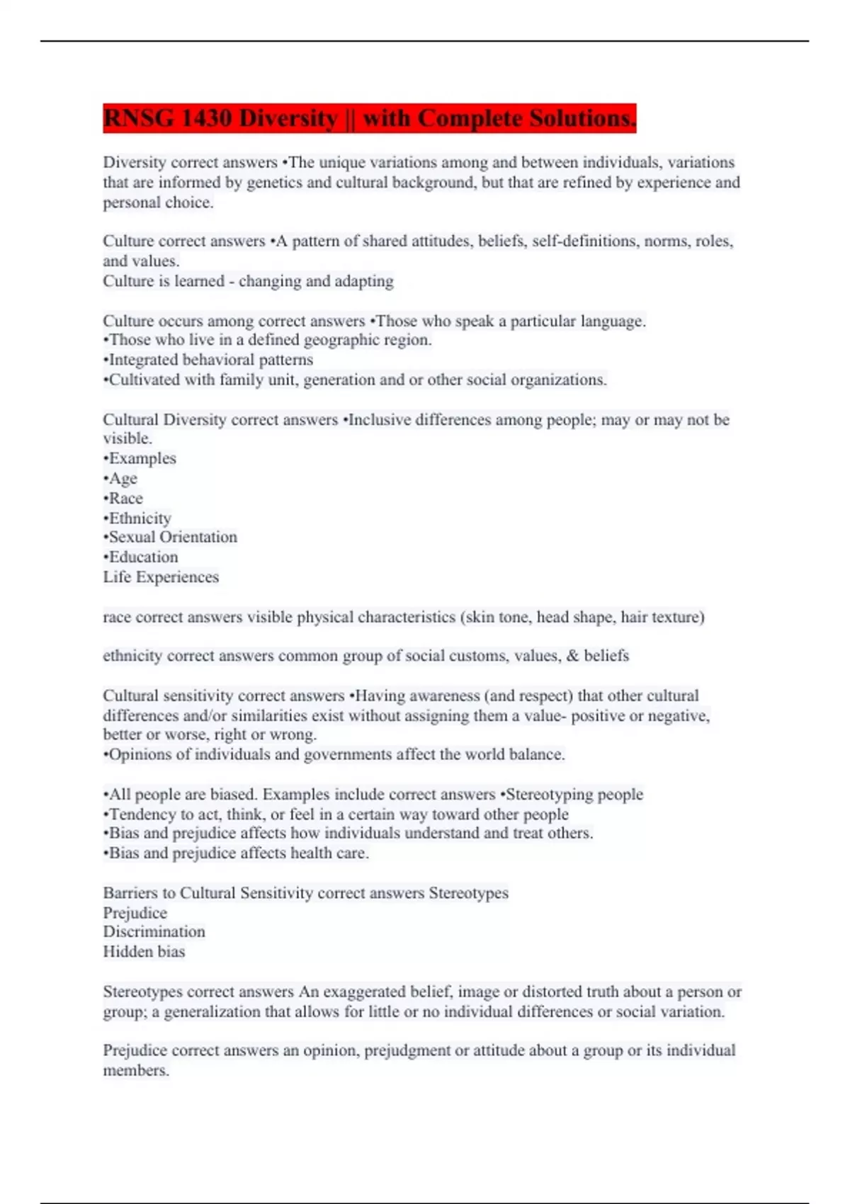 Diversity correct answers •The unique variations among and between individuals, variations that are informed by genetics and cultural background, but that are refined by experience and personal choice. Culture correct answers •A pattern of shared attitudes, beliefs, self-definitions, norms, roles, and values. Culture is learned - changing and adapting Culture occurs among correct answers •Those who speak a particular language. •Those who live in a defined geographic region. •Integrated behavioral patterns •Cultivated with family unit, generation and or other social organizations. Cultural Diversity correct answers •Inclusive differences among people; may or may not be visible. •Examples •Age •Race •Ethnicity •Sexual Orientation •Education Life Experiences race correct answers visible physical characteristics (skin tone, head shape, hair texture) ethnicity correct answers common group of social customs, values, & beliefs Cultural sensitivity correct answers •Having awareness (and respect) that other cultural differences and/or similarities exist without assigning them a value- positive or negative, better or worse, right or wrong. •Opinions of individuals and governments affect the world balance. •All people are biased. Examples include correct answers •Stereotyping people •Tendency to act, think, or feel in a certain way toward other people •Bias and prejudice affects how individuals understand and treat others. •Bias and prejudice affects health care. Barriers to Cultural Sensitivity correct answers Stereotypes Prejudice Discrimination Hidden bias Stereotypes correct answers An exaggerated belief, image or distorted truth about a person or group; a generalization that allows for little or no individual differences or social variation. Prejudice correct answers an opinion, prejudgment or attitude about a group or its individual members.