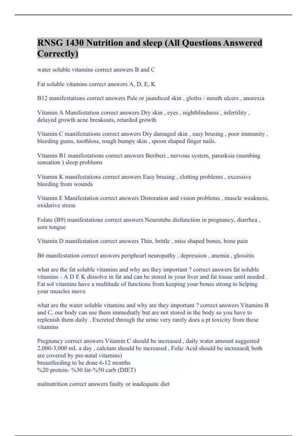 RNSG 1430 Nutrition and sleep (All Questions Answered Correctly)