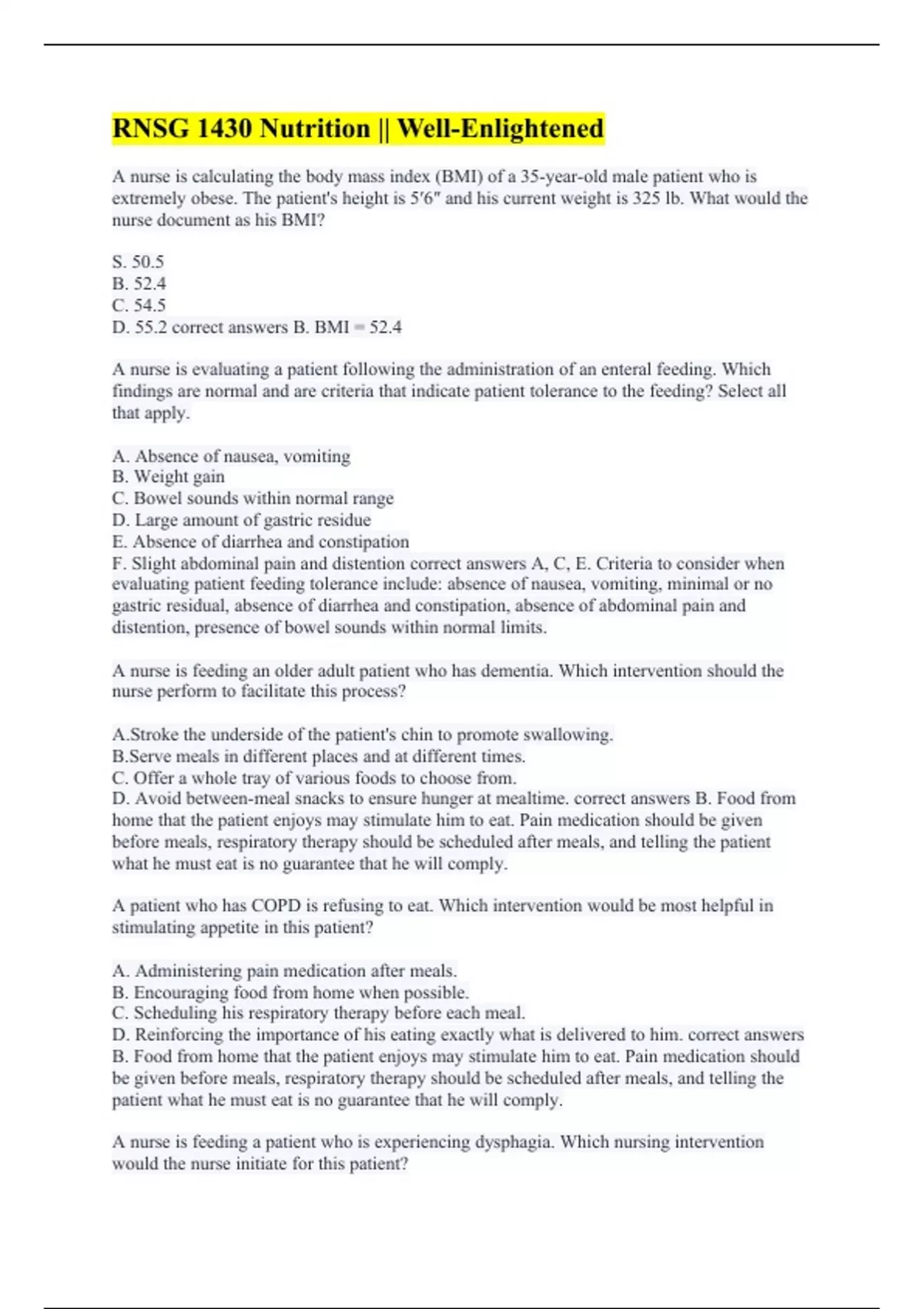 A nurse is calculating the body mass index (BMI) of a 35-year-old male patient who is extremely obese. The patient's height is 5′6″ and his current weight is 325 lb. What would the nurse document as his BMI? S. 50.5 B. 52.4 C. 54.5 D. 55.2 correct answers B. BMI = 52.4 A nurse is evaluating a patient following the administration of an enteral feeding. Which findings are normal and are criteria that indicate patient tolerance to the feeding? Select all that apply. A. Absence of nausea, vomiting B. Weight gain C. Bowel sounds within normal range D. Large amount of gastric residue E. Absence of diarrhea and constipation F. Slight abdominal pain and distention correct answers A, C, E. Criteria to consider when evaluating patient feeding tolerance include: absence of nausea, vomiting, minimal or no gastric residual, absence of diarrhea and constipation, absence of abdominal pain and distention, presence of bowel sounds within normal limits. A nurse is feeding an older adult patient who has dementia. Which intervention should the nurse perform to facilitate this process? A.Stroke the underside of the patient's chin to promote swallowing. B.Serve meals in different places and at different times. C. Offer a whole tray of various foods to choose from. D. Avoid between-meal snacks to ensure hunger at mealtime. correct answers B. Food from home that the patient enjoys may stimulate him to eat. Pain medication should be given before meals, respiratory therapy should be scheduled after meals, and telling the patient what he must eat is no guarantee that he will comply. A patient who has COPD is refusing to eat. Which intervention would be most helpful in stimulating appetite in this patient? A. Administering pain medication after meals. B. Encouraging food from home when possible. C. Scheduling his respiratory therapy before each meal. D. Reinforcing the importance of his eating exactly what is delivered to him. correct answers B. Food from home that the patient enjoys may stimulate him to eat. Pain medication should be given before meals, respiratory therapy should be scheduled after meals, and telling the patient what he must eat is no guarantee that he will comply. A nurse is feeding a patient who is experiencing dysphagia. Which nursing intervention would the nurse initiate for this patient?