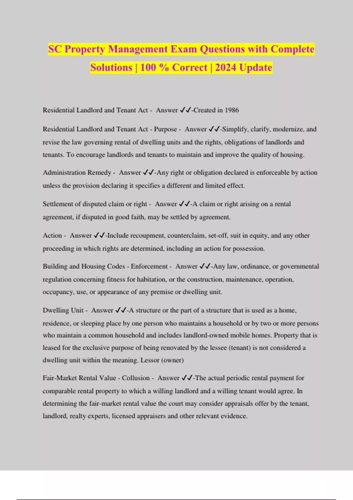 SC Property Management Exam Questions with Complete Solutions | 100 % Correct | 2024 Update Residential Landlord and Tenant Act - Answer ️️ -Created in 1986 Residential Landlord and Tenant Act - Purpose - Answer ️️ -Simplify, clarify, modernize, and revise the law governing rental of dwelling units and the rights, obligations of landlords and tenants. To encourage landlords and tenants to maintain and improve the quality of housing. Administration Remedy - Answer ️️ -Any right or obligation declared is enforceable by action unless the provision declaring it specifies a different and limited effect. Settlement of disputed claim or right - Answer ️️ -A claim or right arising on a rental agreement, if disputed in good faith, may be settled by agreement. Action - Answer ️️ -Include recoupment, counterclaim, set-off, suit in equity, and any other proceeding in which rights are determined, including an action for possession. Building and Housing Codes - Enforcement - Answer ️️ -Any law, ordinance, or governmental regulation concerning fitness for habitation, or the construction, maintenance, operation, occupancy, use, or appearance of any premise or dwelling unit. Dwelling Unit - Answer ️️ -A structure or the part of a structure that is used as a home, residence, or sleeping place by one person who maintains a household or by two or more persons who maintain a common household and includes landlord-owned mobile homes. Property that is leased for the exclusive purpose of being renovated by the lessee (tenant) is not considered a dwelling unit within the meaning. Lessor (owner) Fair-Market Rental Value - Collusion - Answer ️️ -The actual periodic rental payment for comparable rental property to which a willing landlord and a willing tenant would agree. In determining the fair-market rental value the court may consider appraisals offer by the tenant, landlord, realty experts, licensed appraisers and other relevant evidence. Good Faith - Answer ️️ -Honesty in fact in the conduct of the transaction concerned Landlord - Answer ️️ -The owner, lessor, or sublessor of the premises and also means manager of the premises who fails to disclose Organization - Answer ️️ -Includes a corporation, government, governmental subdivision or agency, business trust, estate, trust, partnership or association, two or more persons having a joint or common interest, and any other legal or commercial entity Owner - Answer ️️ -Means one or more persons, jointly or severally, in whom is vested in all or part of the legal title to property or all or part of the beneficial ownership and a right to present use and enjoyment of the premises. The term includes a mortgagee (lender) in possession. Mortgagee - Answer ️️ -A lender in a mortgage loan transaction. Mortgager - Answer ️️ -an owner who gives a security interest in property in order to obtain a loan Person - Answer ️️ -Includes an individual or organization Premises - Property "Appliances" - Answer ️️ -Means a dwelling unit and the structure of which it is a part and facilities and appurtenances therein and grounds, areas, facilities held out for the use of tenants generally or whose use is promised to the tenant. Rent - Answer ️️ -The consideration payable for use of the premises including late charges whether payable in lump sum or periodic payments, excluding security deposits or other charges Rental Agreement - Answer ️️ -All arrangements, written or oral, and valid rules and regulations adopted under Section 27-40-520 embodying the terms and conditions concerning the use and occupancy of a dwelling unit and premises Roomer - Room Renter Only - Answer ️️ -A person occupying a dwelling unit that does not include a toilet and either a bathtub or a shower a refrigerator, stove, and kitchen sink, all provided by the landlord, and where one or more of these facilities are used in common b occupants in the structure. Single Family Residence - Renting a House - Answer ️️ -A structure maintained and used as a single dwelling unit. Not withstanding that a dwelling unit shares one or more walls with another dwelling unit, it is a single family residence if it has direct access to a street or thoroughfare and shares neither heating facilities, hot water equipment, nor any other essential facility or service with any other dwelling unit Tenant - Answer ️️ -A person entitled under a rental agreement to occupy a dwelling in unit to the exclusion of others Wilful - Answer ️️ -An attempt to intention