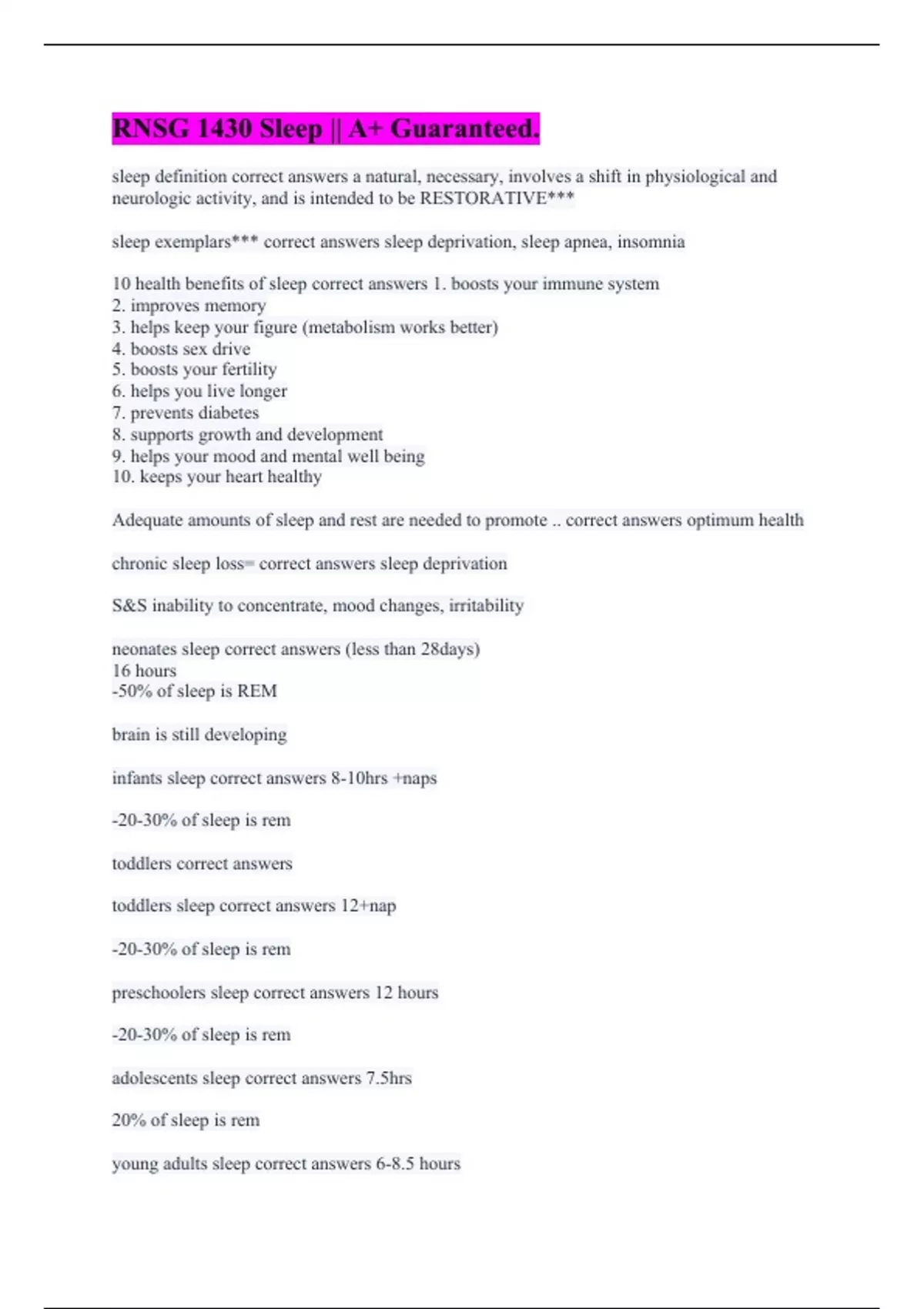 sleep definition correct answers a natural, necessary, involves a shift in physiological and neurologic activity, and is intended to be RESTORATIVE*** sleep exemplars*** correct answers sleep deprivation, sleep apnea, insomnia 10 health benefits of sleep correct answers 1. boosts your immune system 2. improves memory 3. helps keep your figure (metabolism works better) 4. boosts sex drive 5. boosts your fertility 6. helps you live longer 7. prevents diabetes 8. supports growth and development 9. helps your mood and mental well being 10. keeps your heart healthy Adequate amounts of sleep and rest are needed to promote .. correct answers optimum health chronic sleep loss= correct answers sleep deprivation S&S inability to concentrate, mood changes, irritability neonates sleep correct answers (less than 28days) 16 hours -50% of sleep is REM brain is still developing infants sleep correct answers 8-10hrs +naps -20-30% of sleep is rem toddlers correct answers toddlers sleep correct answers 12+nap -20-30% of sleep is rem preschoolers sleep correct answers 12 hours -20-30% of sleep is rem adolescents sleep correct answers 7.5hrs 20% of sleep is rem young adults sleep correct answers 6-8.5 hours