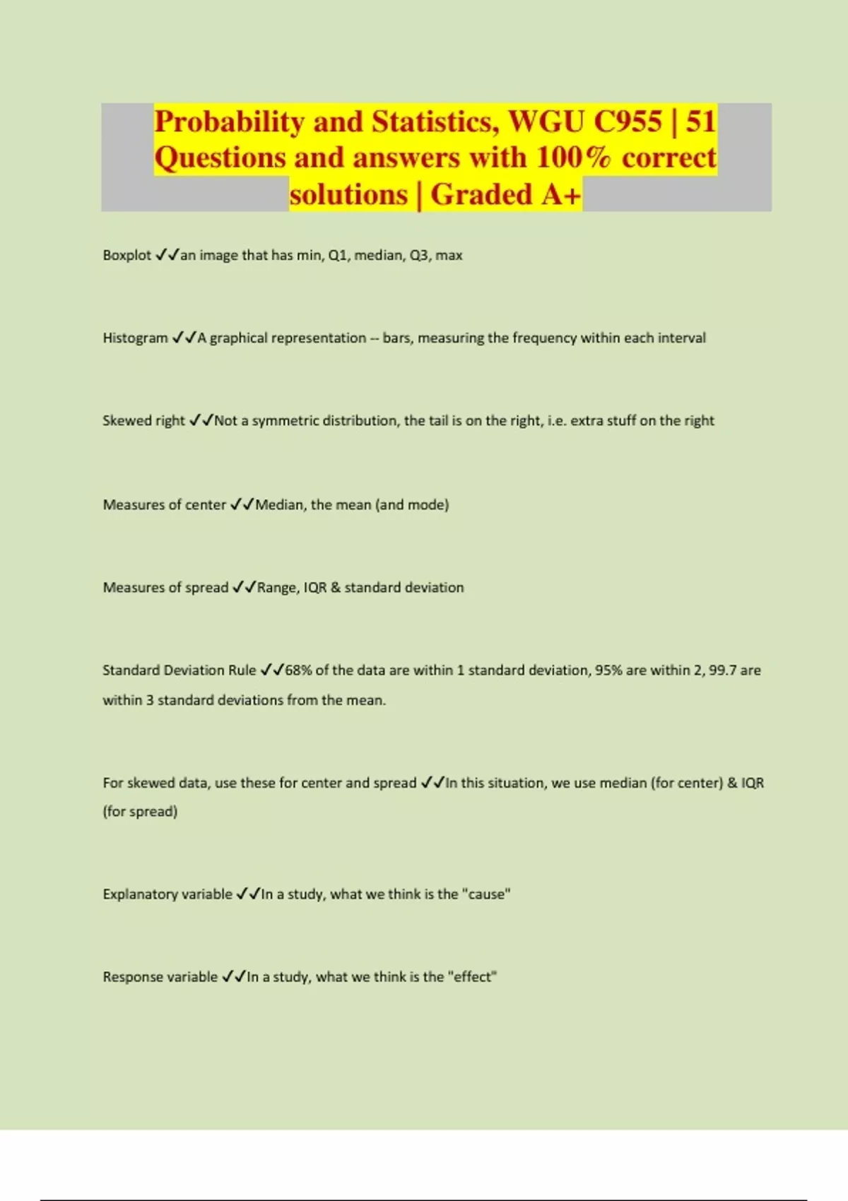 Probability and Statistics, WGU C955 | 51 Questions and answers with 100% correct solutions | Graded A+