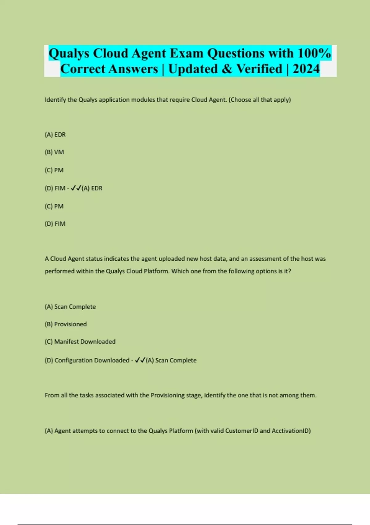 Qualys Cloud Agent Exam Questions with 100% Correct Answers | Updated & Verified | 2024