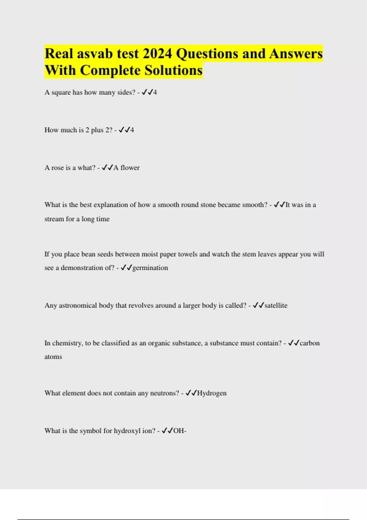 A square has how many sides? - 4 How much is 2 plus 2? - 4 A rose is a what? - A flower What is the best explanation of how a smooth round stone became smooth? - It was in a stream for a long time If you place bean seeds between moist paper towels and watch the stem leaves appear you will see a demonstration of? - germination Any astronomical body that revolves around a larger body is called? - satellite In chemistry, to be classified as an organic substance, a substance must contain? - carbon atoms What element does not contain any neutrons? - Hydrogen What is the symbol for hydroxyl ion? - OHA perpetual-motion machine can never be built because it is not possible to eliminate what? - Clasticity