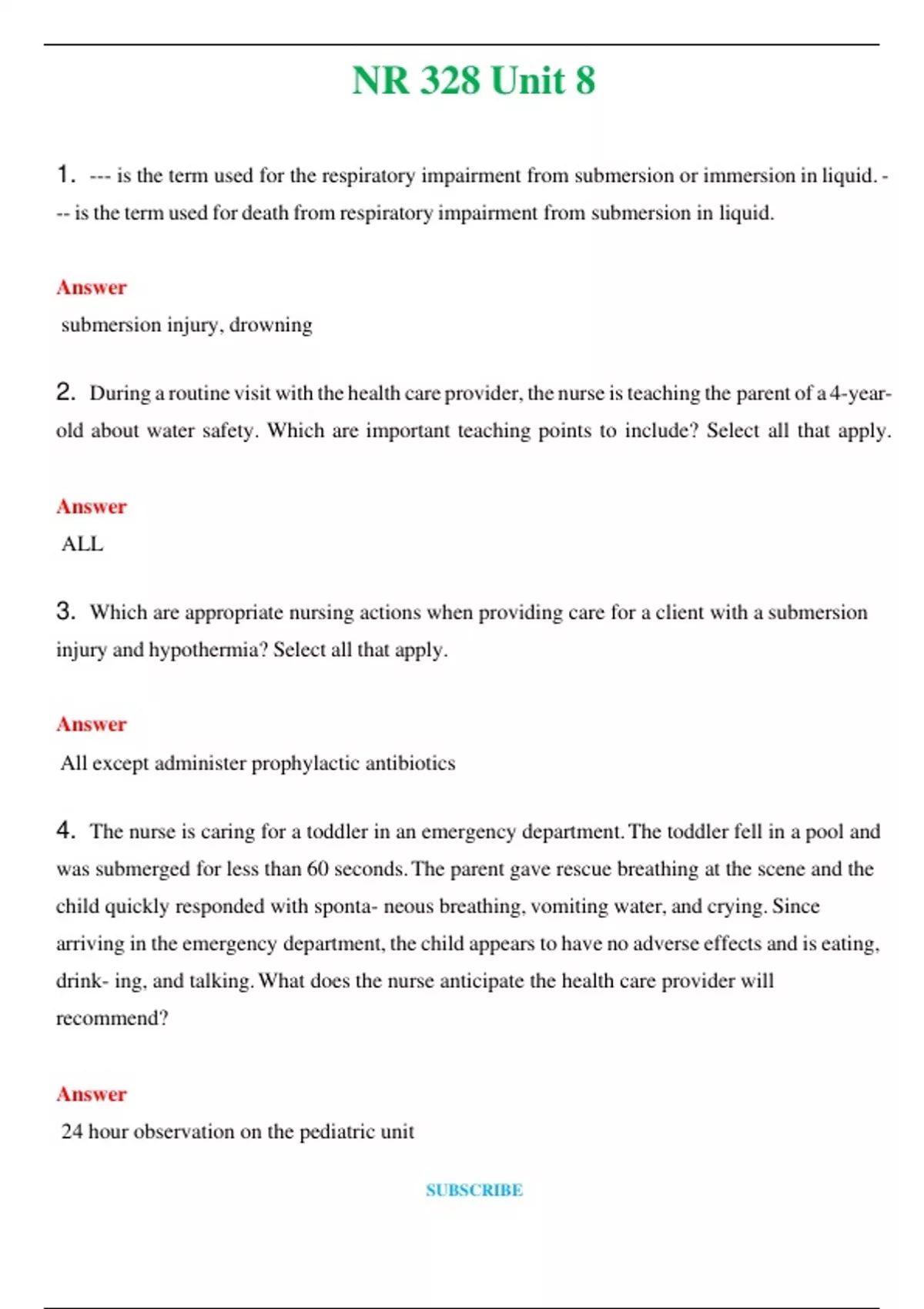 NR 328 Unit 8 - Nursing Care- Drownings (Latest 2024 / 2025) Questions and Answers (Verified Answers)
