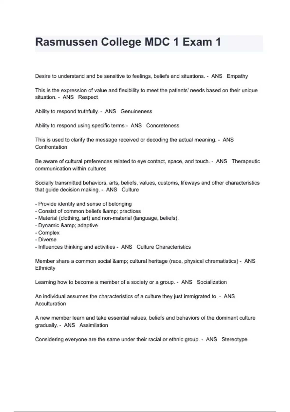 Rasmussen College MDC 1 Exam 1 Questions And Answers Desire to understand and be sensitive to feelings, beliefs and situations. - ANS Empathy This is the expression of value and flexibility to meet the patients' needs based on their unique situation. - ANS Respect Ability to respond truthfully. - ANS Genuineness Ability to respond using specific terms - ANS Concreteness This is used to clarify the message received or decoding the actual meaning. - ANS Confrontation Be aware of cultural preferences related to eye contact, space, and touch. - ANS Therapeutic communication within cultures Socially transmitted behaviors, arts, beliefs, values, customs, lifeways and other characteristics that guide decision making. - ANS Culture - Provide identity and sense of belonging - Consist of common beliefs & practices - Material (clothing, art) and non-material (language, beliefs). - Dynamic & adaptive - Complex - Diverse - Influences thinking and activities - ANS Culture Characteristics Member share a common social & cultural heritage (race, physical chrematistics) - ANS Ethnicity Learning how to become a member of a society or a group. - ANS Socialization An individual assumes the characteristics of a culture they j