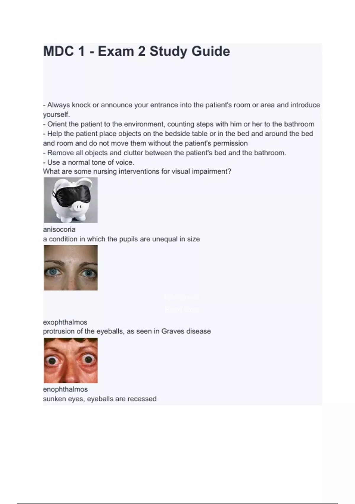 MDC 1 - Exam 2 Study Guide Exam Questions And Answers - Always knock or announce your entrance into the patient's room or area and introduce yourself. - Orient the patient to the environment, counting steps with him or her to the bathroom - Help the patient place objects on the bedside table or in the bed and around the bed and room and do not move them without the patient's permission - Remove all objects and clutter between the patient's bed and the bathroom. - Use a normal tone of voice. What are some nursing interventions for visual impairment? anisocoria a condition in which the pupils are unequal in size Brainpower Read More exophthalmos protrusion of the eyeballs, as seen in Graves disease enophthalmos sunken eyes, eyeballs are recessed
