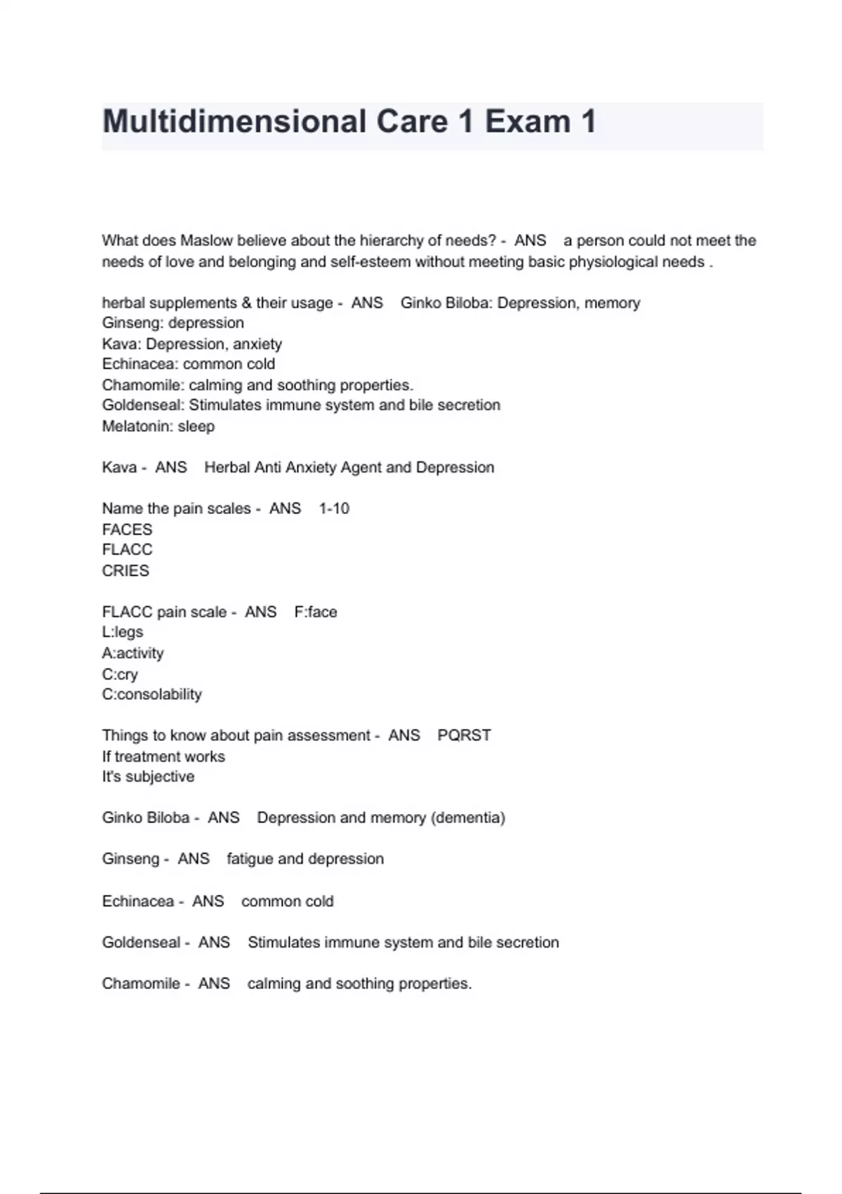 Multidimensional Care 1 Exam 1 Questions and Answers What does Maslow believe about the hierarchy of needs? - ANS a person could not meet the needs of love and belonging and self-esteem without meeting basic physiological needs . herbal supplements & their usage - ANS Ginko Biloba: Depression, memory Ginseng: depression Kava: Depression, anxiety Echinacea: common cold Chamomile: calming and soothing properties. Goldenseal: Stimulates immune system and bile secretion Melatonin: sleep Kava - ANS Herbal Anti Anxiety Agent and Depression Name the pain scales - ANS 1-10 FACES FLACC CRIES FLACC pain scale - ANS F:face L:legs A:activity C:cry C:consolability Things to know about pain assessment - ANS PQRST If treatment works It's subjective Ginko Biloba - ANS Depression and memory (dementia)