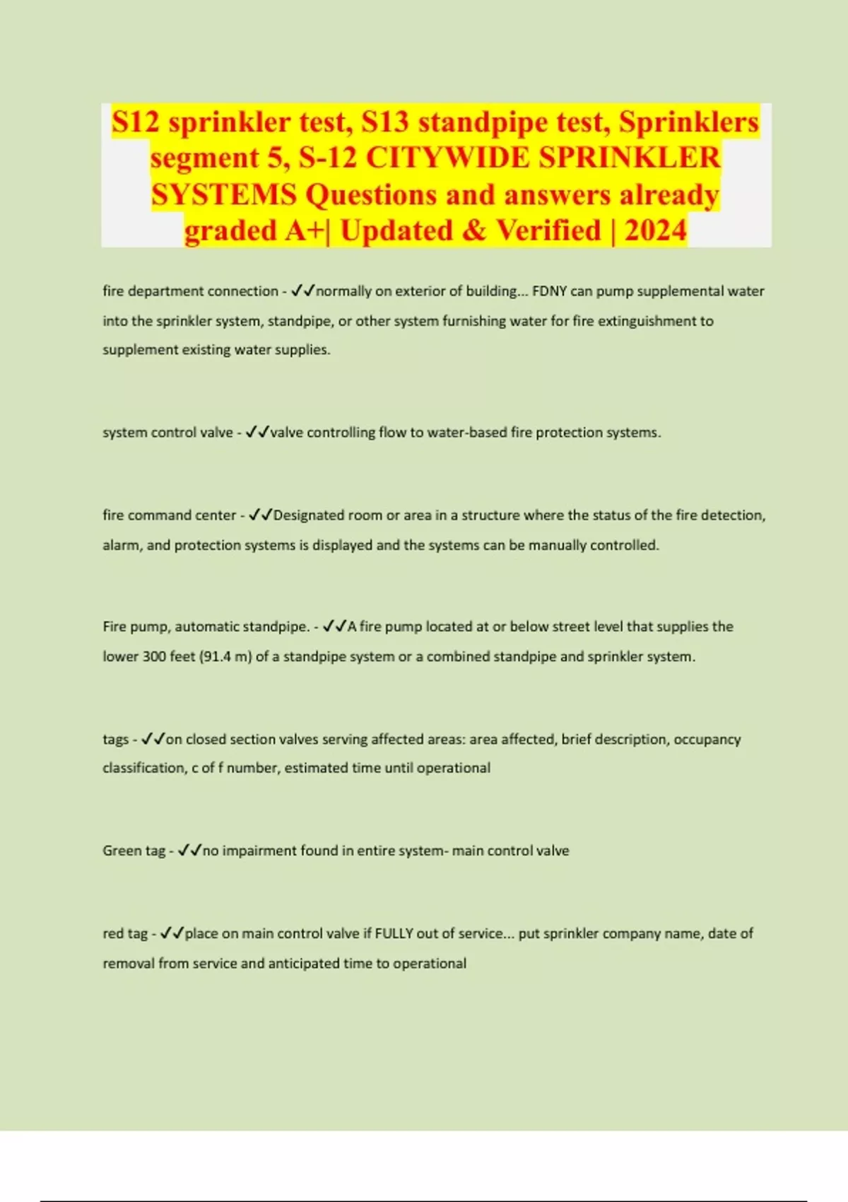 S12 sprinkler test, S13 standpipe test, Sprinklers segment 5, S-12 CITYWIDE SPRINKLER SYSTEMS Questions and answers already graded A+| Updated & Verified | 2024