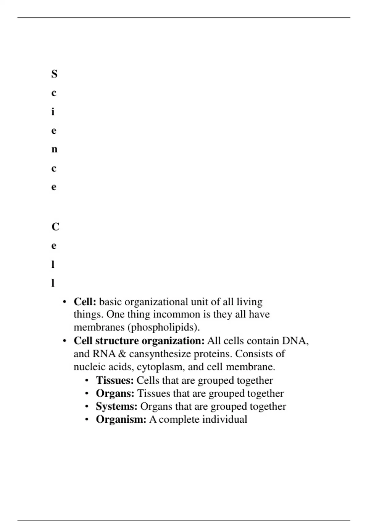 S c i e n c e C e l l • Cell: basic organizational unit of all living things. One thing incommon is they all have membranes (phospholipids). • Cell structure organization: All cells contain DNA, and RNA & cansynthesize proteins. Consists of nucleic acids, cytoplasm, and cell membrane. • Tissues: Cells that are grouped together • Organs: Tissues that are grouped together • Systems: Organs that are grouped together • Organism: A complete individual