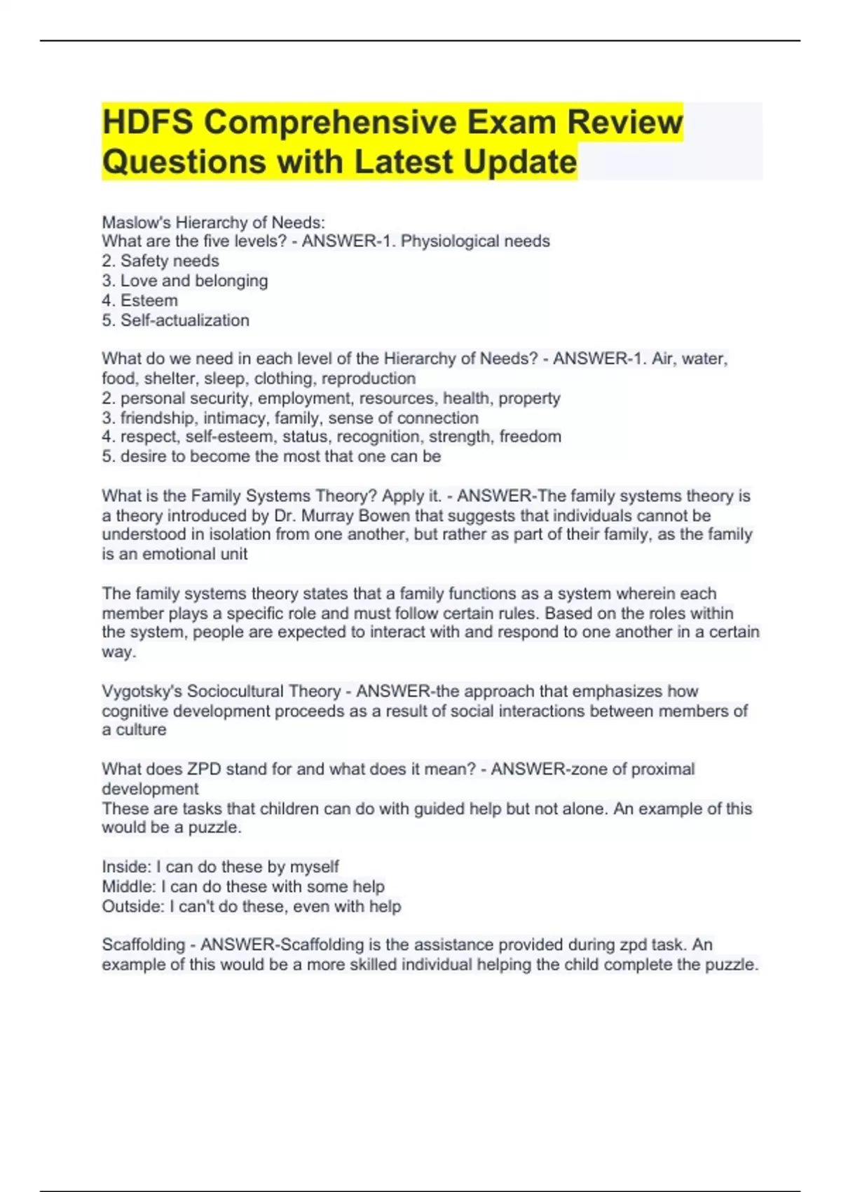 Maslow's Hierarchy of Needs: What are the five levels? - ANSWER-1. Physiological needs 2. Safety needs 3. Love and belonging 4. Esteem 5. Self-actualization What do we need in each level of the Hierarchy of Needs? - ANSWER-1. Air, water, food, shelter, sleep, clothing, reproduction 2. personal security, employment, resources, health, property 3. friendship, intimacy, family, sense of connection 4. respect, self-esteem, status, recognition, strength, freedom 5. desire to become the most that one can be What is the Family Systems Theory? Apply it. - ANSWER-The family systems theory is a theory introduced by Dr. Murray Bowen that suggests that individuals cannot be understood in isolation from one another, but rather as part of their family, as the family is an emotional unit The family systems theory states that a family functions as a system wherein each member plays a specific role and must follow certain rules. Based on the roles within the system, people are expected to interact with and respond to one another in a certain way. Vygotsky's Sociocultural Theory - ANSWER-the approach that emphasizes how cognitive development proceeds as a result of social interactions between members of a culture What does ZPD stand for and what does it mean? - ANSWER-zone of proximal development These are tasks that children can do with guided help but not alone. An example of this would be a puzzle. Inside: I can do these by myself Middle: I can do these with some help Outside: I can't do these, even with help Scaffolding - ANSWER-Scaffolding is the assistance provided during zpd task. An example of this would be a more skilled individual helping the child complete the puzzle.