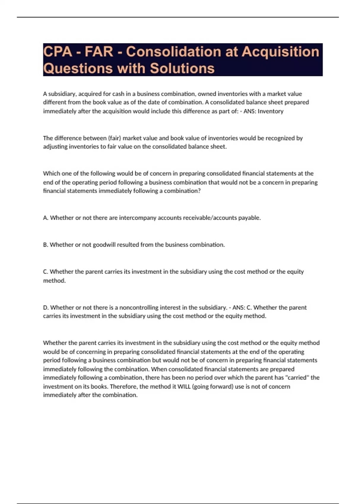 CPA - FAR - Consolidation at Acquisition Questions with Solutions