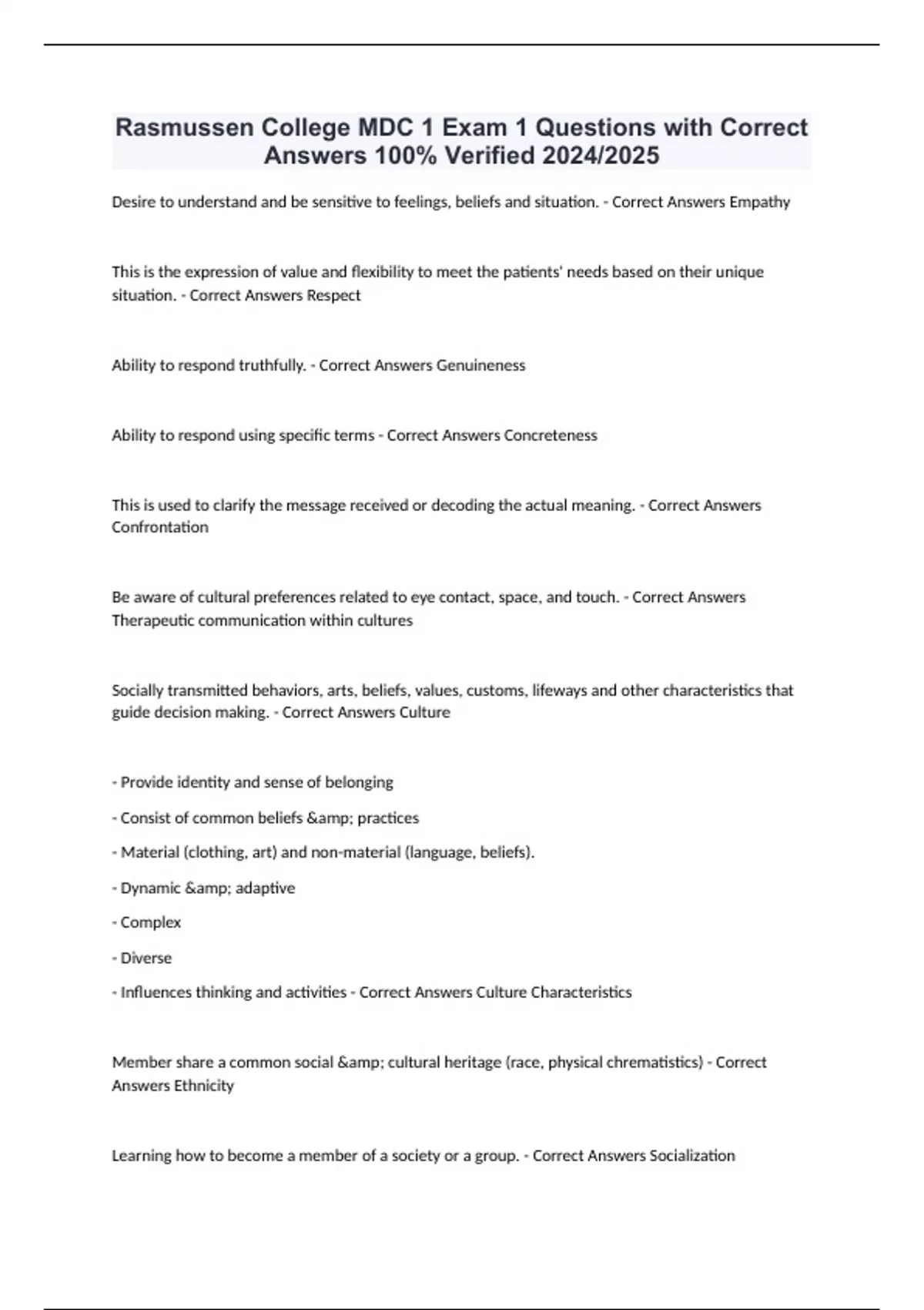 Rasmussen College MDC 1 Exam 1 Questions with Correct Answers 100% Verified 2024/2025 Desire to understand and be sensitive to feelings, beliefs and situation. - Correct Answers Empathy This is the expression of value and flexibility to meet the patients' needs based on their unique situation. - Correct Answers Respect Ability to respond truthfully. - Correct Answers Genuineness Ability to respond using specific terms - Correct Answers Concreteness This is used to clarify the message received or decoding the actual meaning. - Correct Answers Confrontation Be aware of cultural preferences related to eye contact, space, and touch. - Correct Answers Therapeutic communication within cultures Socially transmitted behaviors, arts, beliefs, values, customs, lifeways and other characteristics that guide decision making. - Correct Answers Culture - Provide identity and sense of belonging - Consist of common beliefs & practices - Material (clothing, art) and non-material (language, beliefs). - Dynamic & adaptive - Complex - Diverse - Influences thinking and activities - Correct Answers Culture Characteristics Member share a common social & cultural heritage (race, physical chrematistics) - Correct Answers Ethnicity Learning how to becom