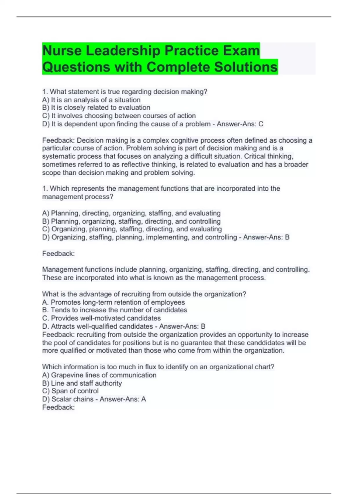 Nurse Leadership Practice Exam Questions with Complete Solutions Feedback: Values, life experience, individual preference, and individual ways of thinking will influence a person's decision making. No matter how objective the criteria will be, value judgments will always play a part in a person's decision making, either consciously or subconsciously. 3. Which time waster does the manager have least control over? A. Failure to set objectives B. Inability to say no C. Procrastination D. Paperwork overload - Answer-ANS: D Feedback: Excessive paperwork is an external time waster, the others are time wasters created by the manager (internal). 3. What assumption about workers does Theory X hold? A) Workers will naturally put forth effort B) Workers need threats to be motivated C) Workers are diligent and responsible D) Workers are in tune with organizational needs - Answer-Ans: B Feedback: Theory X managers believe that their employees are basically lazy, need constant supervision and direction, and are indifferent to organizational needs. Which reason qualifies as organizational justification for a career development program? A) Employee attrition can be reduced B) Personnel can be used more effectively C) Employees can increase earning power D) Employment benefits are increased - Answer-Ans: C, D Feedback: organizational justification for career develoment programs includes attrition reduction, improved productivity, and general improved quality of life. Although employees may earn more money and additonal benefits as a result of career development, they are not the reason that organizations undertake career development programs. Which statement concerning organizational culture is true? A) It presents how employees "perceive" an organization B) It defines how power is used by organizations to direct the work of others C) It describes the predictable stages of group and organizational development D) It is a system of symbols, beliefs, values, history, and communication patterns - Answer-Ans: D Feedback: Organizational culture is the symbols and beliefs, values, history, and communication patterns of the organization. It differs from organizational climate, which is how the employees perceive the organization. The other options are not relevant to the term organizational culture. Which statement best describes the managers role in socialization? A) Providing the employee with organizational rules and regulations B) Providing the new employee with a good preceptor C) Ensuring that there are sufficient numbers of good role models D) Sharing organizational values, expected attitudes, and history - Answer-Ans: D Feedback: New group members must be socialized into the group, and these socialization efforts are led by the manager. Which is a motivating factor identified in Herzberg's motivation-hygiene theory? A) Money B) A chance for promotion C) A well-lighted parking lot D) Free meals in the cafeteria - Answer-Ans: B Feedback: Herzberg maintained that motivators such as promotion are present in work itself; they give people the desire to perform well. The other options were viewed less impactful on motivation. Which statement concerning nonverbal communication is true? A) It is consistent across cultures B) It is given more credence than verbal communication when the two are incongruent C) It should be minimized because it confuses the receiver regarding the true intent of the message D) It is a significant part of the communication exchange only when it is not congruent with the verbal exchange - Answer-Ans: B Feedback: Because nonverbal communication indicates the emotional component of the message, it is generally considered more reliable than verbal communication. None of the remaining options present true statements regarding nonverbal communication. You overhear an experienced nurses say to a new nurse, iSorry you wont be able to join us for our weekly get-together at the local yogurt shop. I see you are going to be here charting for a while yet.i What is this an example of? A) Behavior that supports positive sanctions B) An application of a sanction regarding group norms C) Constructive feedback about expected group norms D) Role modeling desired behavior - Answer-Ans: B Feedback: Negative sanctions provide cues that enable people to evaluate their performance and modify behavior when needed. In this case, the experienced nurse is letting the new nurse know that the groups weekly outing is important, and on that day the staff makes sure they finish their work on time. It may also suggest that detailed charting is not valued.
