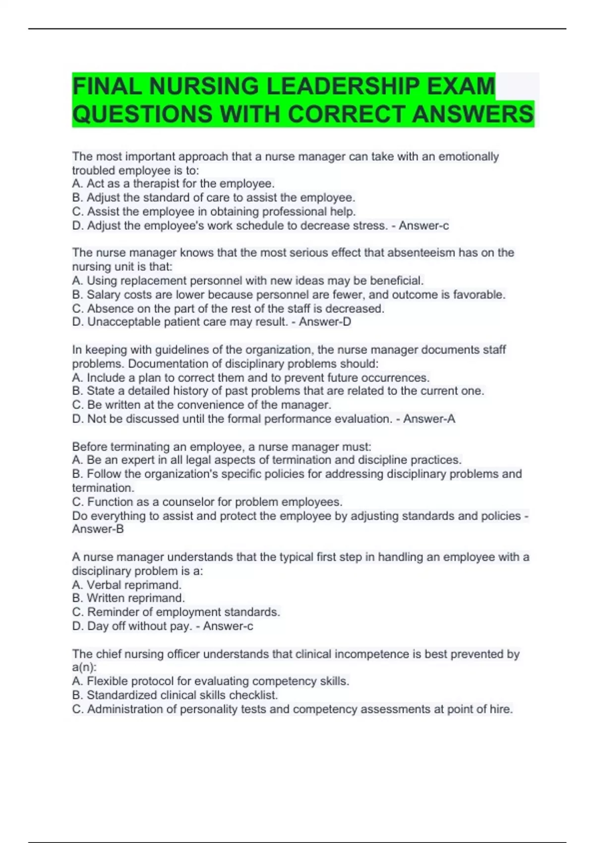 FINAL NURSING LEADERSHIP EXAM QUESTIONS WITH CORRECT ANSWERS 1. Melissa is a nursing graduate of 5 years who is very confident in her clinical skills. She has taken some certificate courses in leadership and management and has considered beginning a graduate degree with this focus. She is excited about being able to use her knowledge and interest by being hired as a nurse manager. Before beginning her new position, Melissa spends time with her nurse executive to clarify the executive's expectations of her and of the unit that she has been hired to manage. After beginning her new position, Melissa finds that she spends a great deal of time in direct patient care. Her staff begins to complain that they are never able to find her when they need her, and that some aspects of her responsibilities fall behind, such as scheduling. Melissa is most likely: 1) Lacking an understanding of the nurse management role. 2) Attempting to prove her clinical skills to the nursing staff. 3) Lacki - Answer-4 1. Sarah is a nursing graduate of 5 years who is very confident in her clinical skills. She has taken some certificate courses in leadership and management and has considered beginning a graduate degree with this focus. She is excited about being able to use her knowledge and interest by being hired as anurse manager. Before beginning her new position, Sarah spends time with her nurse executive to clarify the executive's expectations of her and of the unit that she has been hired to manage. Sarah finds a mentor, Amy, who has been in the role of unit manager for 3 years and has a similar interest in clinical excellence. During their frequent meetings, Amy provides assistance with learning aspects of the manager's role, including technical aspects, such as how to interpret budget printouts and to achieve budget outcomes. The success of Amy's coaching depends on: 1) Willingness of Sarah to receive feedback. 2) Organiza - Answer-1 . Sarah is a nursing graduate of 5 years who is very confident in her clinical skills. She has taken some certificate courses in leadership and management and has considered beginning a graduate degree with this focus. She is excited about being able to use her knowledge and interest by being hired as a nurse manager. Before beginning her new position, Sarah spends time with her nurse executive to clarify the executive's expectations of her and of the unit that she has been hired to manage. After a year, Sarah successfully transitions into the nurse manager role and considers taking the examination to become a certified nurse executive. Amy advises her that this is not possible because Sarah will need: 1) 5 years of successful experience. 2) At least a nursing diploma. 3) 24 months of experience. 4) A graduate degree. - Answer-3 7. Seth is hired as the nurse manager for a surgical unit. After a year, the hospital reorganizes, and his position is lost. In leaving the unit, it is important for Seth to: 1) Hire a lawyer to represent his interests during this unexpected role transition. 2) Negotiate a reasonable settlement. 3) Engage in clarifying why the hospital did not state its expectations for the unit at the time of hiring. 4) Seek counseling to deal with his shock and anger. - Answer-2