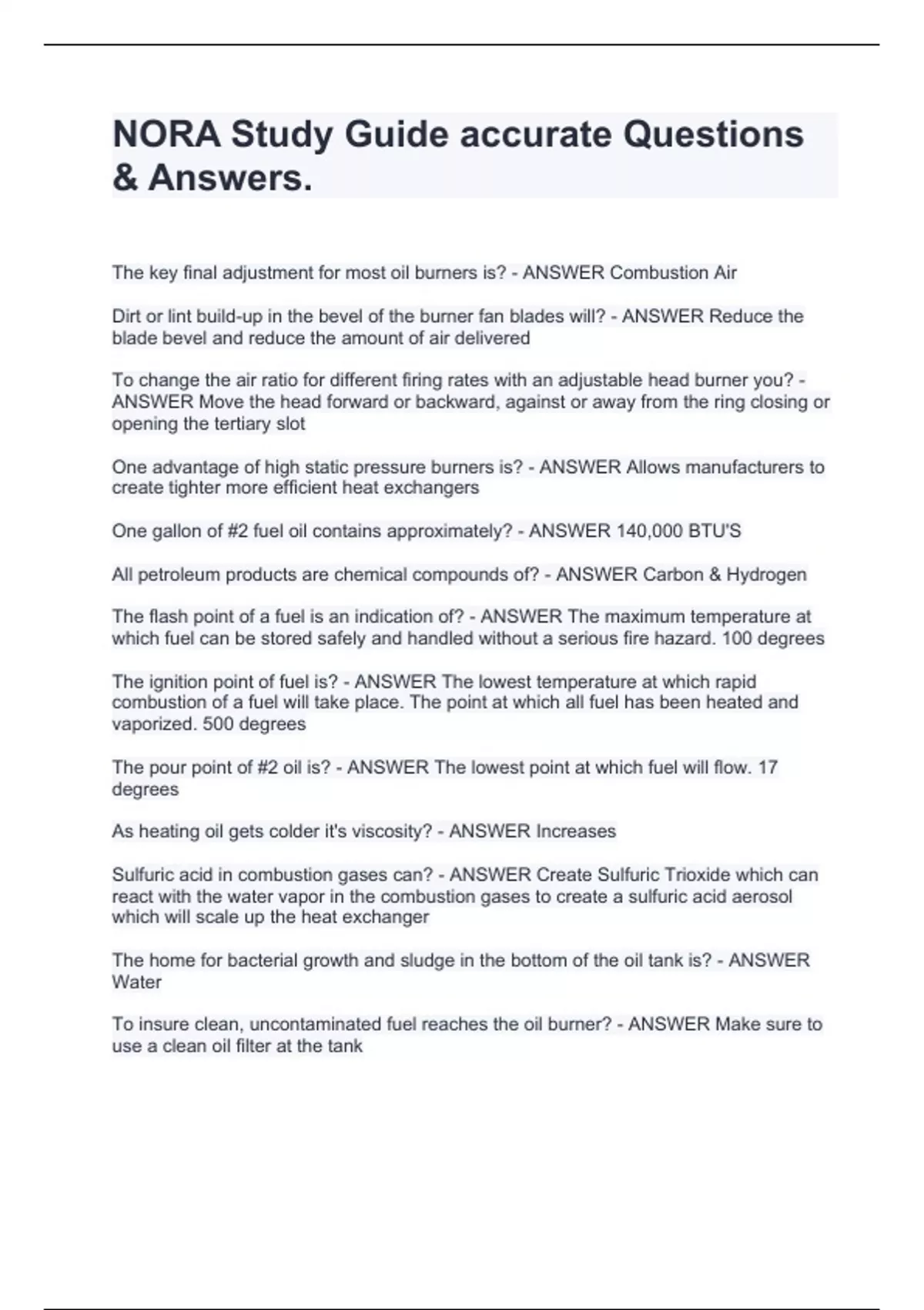 The key final adjustment for most oil burners is? - ANSWER Combustion Air Dirt or lint build-up in the bevel of the burner fan blades will? - ANSWER Reduce the blade bevel and reduce the amount of air delivered To change the air ratio for different firing rates with an adjustable head burner you? - ANSWER Move the head forward or backward, against or away from the ring closing or opening the tertiary slot One advantage of high static pressure burners is? - ANSWER Allows manufacturers to create tighter more efficient heat exchangers One gallon of #2 fuel oil contains approximately? - ANSWER 140,000 BTU'S All petroleum products are chemical compounds of? - ANSWER Carbon & Hydrogen The flash point of a fuel is an indication of? - ANSWER The maximum temperature at which fuel can be stored safely and handled without a serious fire hazard. 100 degrees The ignition point of fuel is? - ANSWER The lowest temperature at which rapid combustion of a fuel will take place. The point at which all fuel has been heated and vaporized. 500 degrees The pour point of #2 oil is? - ANSWER The lowest point at which fuel will flow. 17 degrees As heating oil gets colder it's viscosity? - ANSWER Increases Sulfuric acid in combustion gases can? - ANSWER Create Sulfuric Trioxide which can react with the water vapor in the combustion gases to create a sulfuric acid aerosol which will scale up the heat exchanger The home for bacterial growth and sludge in the bottom of the oil tank is? - ANSWER Water To insure clean, uncontaminated fuel reaches the oil burner? - ANSWER Make sure to use a clean oil filter at the tank