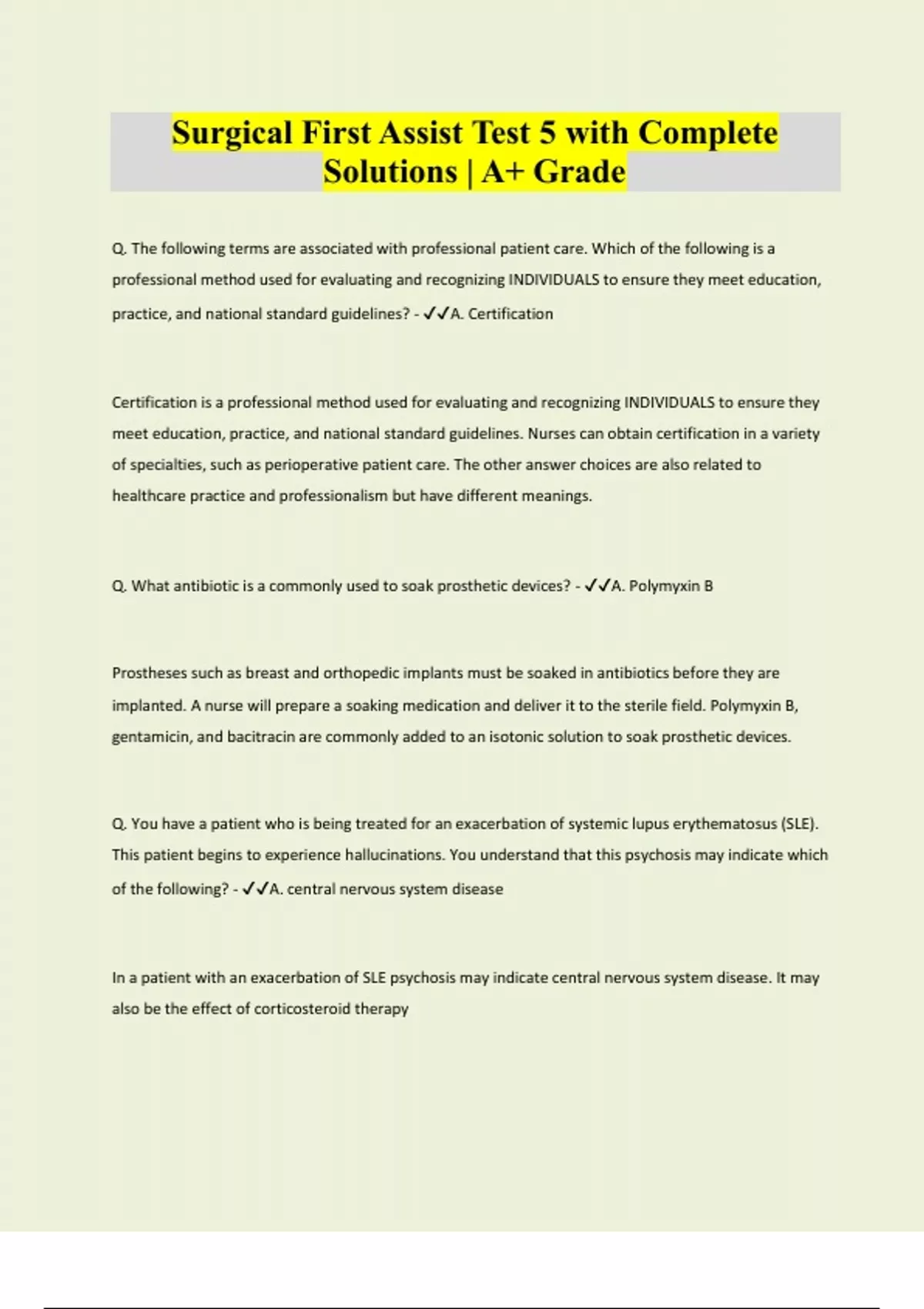 Q. The following terms are associated with professional patient care. Which of the following is a professional method used for evaluating and recognizing INDIVIDUALS to ensure they meet education, practice, and national standard guidelines? - A. Certification Certification is a professional method used for evaluating and recognizing INDIVIDUALS to ensure they meet education, practice, and national standard guidelines. Nurses can obtain certification in a variety of specialties, such as perioperative patient care. The other answer choices are also related to healthcare practice and professionalism but have different meanings. Q. What antibiotic is a commonly used to soak prosthetic devices? - A. Polymyxin B Prostheses such as breast and orthopedic implants must be soaked in antibiotics before they are implanted. A nurse will prepare a soaking medication and deliver it to the sterile field. Polymyxin B, gentamicin, and bacitracin are commonly added to an isotonic solution to soak prosthetic devices. Q. You have a patient who is being treated for an exacerbation of systemic lupus erythematosus (SLE). This patient begins to experience hallucinations. You understand that this psychosis may indicate which of the following? - A. central nervous system disease In a patient with an exacerbation of SLE psychosis may indicate central nervous system disease. It may also be the effect of corticosteroid therapyQ. Ellen is establishing milestones and patient goals with a patient who is being treated for chronic foot pain. What is a reasonable go