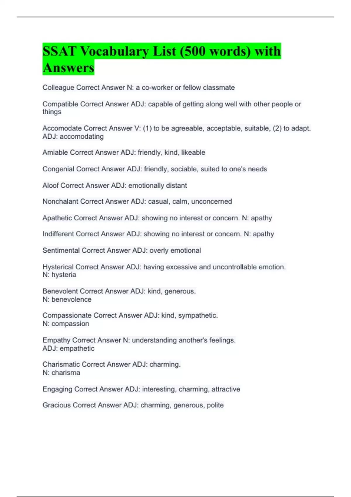 Colleague Correct Answer N: a co-worker or fellow classmate Compatible Correct Answer ADJ: capable of getting along well with other people or things Accomodate Correct Answer V: (1) to be agreeable, acceptable, suitable, (2) to adapt. ADJ: accomodating Amiable Correct Answer ADJ: friendly, kind, likeable Congenial Correct Answer ADJ: friendly, sociable, suited to one's needs Aloof Correct Answer ADJ: emotionally distant Nonchalant Correct Answer ADJ: casual, calm, unconcerned Apathetic Correct Answer ADJ: showing no interest or concern. N: apathy Indifferent Correct Answer ADJ: showing no interest or concern. N: apathy Sentimental Correct Answer ADJ: overly emotional Hysterical Correct Answer ADJ: having excessive and uncontrollable emotion. N: hysteria Benevolent Correct Answer ADJ: kind, generous. N: benevolence Compassionate Correct Answer ADJ: kind, sympathetic. N: compassion Empathy Correct Answer N: understanding another's feelings. ADJ: empathetic Charismatic Correct Answer ADJ: charming. N: charisma Engaging Correct Answer ADJ: interesting, charming, attractive Gracious Correct Answer ADJ: charming, generous, polite Courteous Correct Answer ADJ: polite. N: courtesy Cordial Correct Answer ADJ: polite, friendly Tact Correct Answer N: consideration and sensitivity in dealing with others. ADJ: tactful Emulate Correct Answer V: to copy or imitate, to look up to Flatter Correct Answer V: to praise excessively or dishonestly. N: flattery Fidelity Correct Answer N: faithfulness, loyalty Steadfast Correct Answer ADJ: determined, loyal, steady Fickle Correct Answer ADJ: not reliable or dependable, changing opinions frequently Headstrong Correct Answer ADJ: stubborn, disobedient Obstinate Correct Answer ADJ: stubborn, disobedient. N: obstinacy Exasperate Correct Answer V: to annoy, irritate ADJ: exasperating Infuriate Correct Answer V: to anger or enrage. ADJ: infuriating Indignant Correct Answer ADJ: outraged, angry at something unjust Mock Correct Answer V: to ridicule or make fun of. N: mockery Malicious Correct Answer ADJ: intending to harm or cause suffering N: malice Exploit Correct Answer (1) V: to take advantage of, (2) N: a bold action or deed Belittle Correct Answer V: to put someone down, to express a negative opinion Jeer Correct Answer V: to laugh at with scorn, N: a scornful laugh
