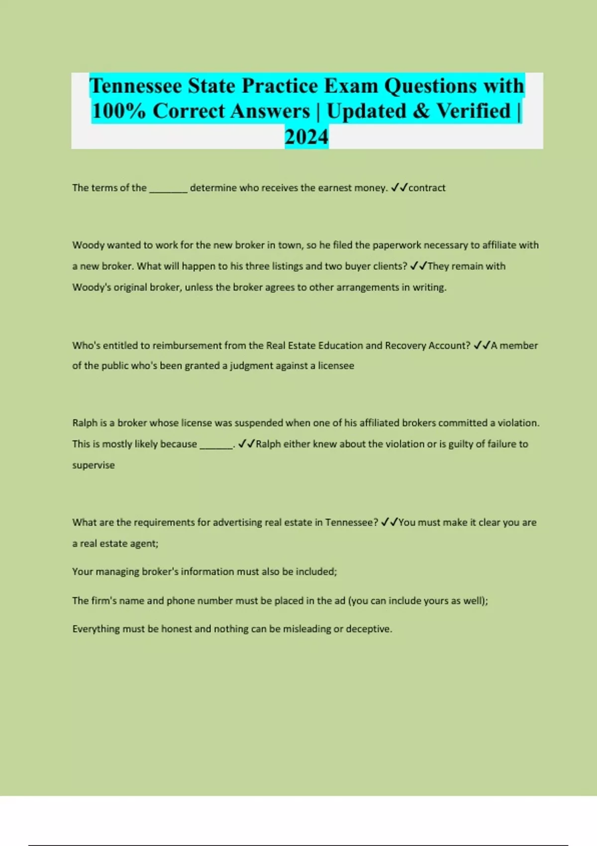 The terms of the _______ determine who receives the earnest money. contract Woody wanted to work for the new broker in town, so he filed the paperwork necessary to affiliate with a new broker. What will happen to his three listings and two buyer clients? They remain with Woody's original broker, unless the broker agrees to other arrangements in writing. Who's entitled to reimbursement from the Real Estate Education and Recovery Account? A member of the public who's been granted a judgment against a licensee Ralph is a broker whose license was suspended when one of his affiliated brokers committed a violation. This is mostly likely because ______. Ralph either knew about the violation or is guilty of failure to supervise What are the requirements for advertising real estate in Tennessee? You must make it clear you are a real estate agent; Your managing broker's information must also be included; The firm's name and phone number must be placed in the ad (you can include yours as well); Everything must be honest and nothing can be misleadin