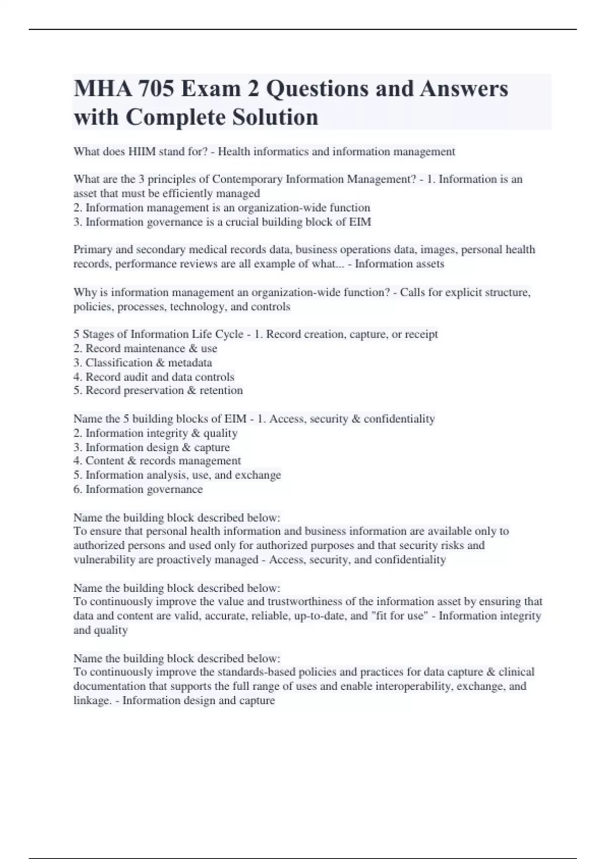 MHA 705 Exam 2 Questions and Answers with Complete Solution What does HIIM stand for? - Health informatics and information management What are the 3 principles of Contemporary Information Management? - 1. Information is an asset that must be efficiently managed 2. Information management is an organization-wide function 3. Information governance is a crucial building block of EIM Primary and secondary medical records data, business operations data, images, personal health records, performance reviews are all example of what... - Information assets Why is information management an organization-wide function? - Calls for explicit structure, policies, processes, technology, and controls 5 Stages of Information Life Cycle - 1. Record creation, capture, or receipt 2. Record maintenance & use 3. Classification & metadata 4. Record audit and data controls 5. Record preservation & retention Name the 5 building blocks of EIM - 1. Access, security & confidentiality 2. Information integrity & quality 3. Information design & capture 4. Content & records management 5. Information analysis, use, and exchange 6. Information governance Name the building block described below: To ensure that personal health information and business information are available only to authorized persons and used only for authorized purposes and that security risks and vulnerability are proactively managed - Access, security, and confidentiality Name the building block described below: To continuously improve the value and trustworthiness of the information asset by ensuring that data and content are valid, accurate, reliable, up-to-date, and "fit for use" - Information integrity and quality Name the building block described below: To continuously improve the standards-based policies and practices for data capture & clinical documentation that supports the full range of uses and enable interoperability, exchange, and linkage. - Information design and capture Name the building block described below: To align data and content requirements and availability to the needs of those who rely on information for a range of clinical and business uses and ensure that those who must act on information have the requisite tools and skills to use it effectively. - Information analysis, use, and exchange Name the building block described below: To ensure leadership and organizational practices, resources, and controls for effective, compliant, and ethical stewardship of information assets to enable best clinical and business practices and serve patients, stakeholders, and the public good. - Information governance Name the building block described below: t To continuously improve the methods whereby corporate and health records and data content are maintained across their life cycle and regardless of media, to ensure compliance with regulatory, accreditation, and legal best practices. - Content and records management • Compliance focused • Gaps in policy framework • Focus on threats of punishment for noncompliance • Vulnerabilities in planning for disruptions • Limited connections between related functions, for example, privacy and security have limited crossover ... explains what building block Pre-EIM? - Access, security, and confidentiality • Stewardship focused • Policy planning integral to process, system changes • Incentives for sound stewardship • Business continuity planning and plan • Safeguards against accidental or deliberate information corruption due to accidental failures or deliberate fraud • Routine audits of compliance leading to improvement ... explains what building block in EIM culture? - Access, security, and confidentiality • Limited systematic data quality assessment • Reactive response to data quality problems • Lack of trust in data • Lack of standard protocols for error correction • Data scrubbing and cleansing in the creation of data warehouses • Modification of existing systems to accommodate changes such as new regulations ...explains what building block Pre-EIM? - Information integrity and quality • Standards- and definitions-based data capture • Knowledge of data provenance and lineage • Protocols for monitoring end-to-end impact of conversions and upgrades • Systematic data quality monitoring based on assessed risks • Error correction and amendment processes ...explains what building block in EIM culture? - Information integrity and quality • Adapted work process to technology constraints • Highly customized solutions with wide personal preference latitude • Documentation improvement as an overlay to the process of data capture • Productivity barriers leading to poor morale • User interface issues impeding safe and effective care ...explains what building block Pre-EIM? - Information design and capture • Process for assessing data needs and improving data capture and documentation over time • Knowledgeable and proactive users behind coordinated efforts to improve the design of technology and the tools used for data capture • Understood and addressed impact on productivity and user acceptability of how structured and unstructured data are captured and available ...explains what building block in EIM culture? - Information design and capture • Records management not addressed in specifications for technology acquisition • Permanent retention of all the data • Data silos and data owners unaware of rules for records management • Unmanaged content accumulates in an increasing number of files and applications • The official health record has information holes because valuable unstructured data are inaccessible • Data redundancy expands ...explains what building block Pre-EIM? - Content and records management • Policies expanded to include the range of record types • Policies linked to business strategy • Retention policies and planning • Audit practices to ensure that policies and practices are being carried out • Records management issu