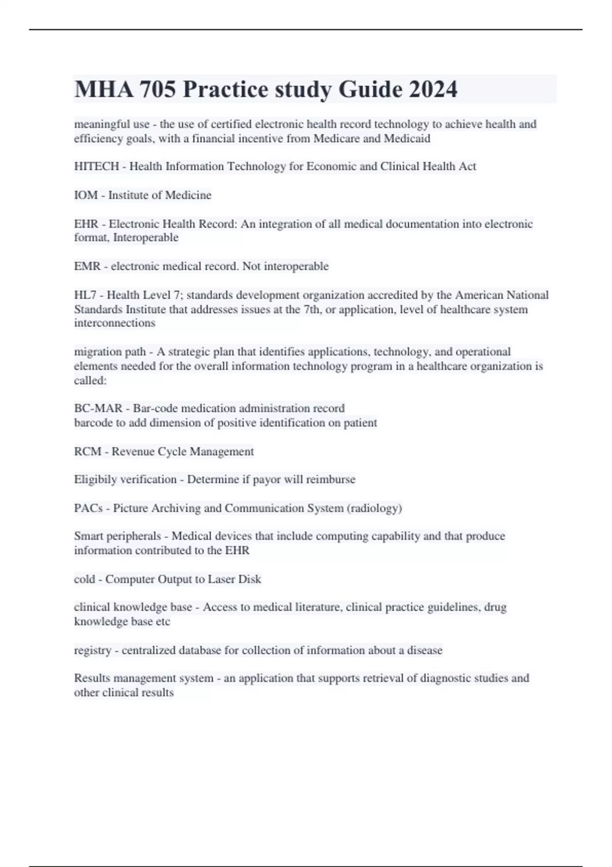 MHA 705 Practice study Guide 2024 meaningful use - the use of certified electronic health record technology to achieve health and efficiency goals, with a financial incentive from Medicare and Medicaid HITECH - Health Information Technology for Economic and Clinical Health Act IOM - Institute of Medicine EHR - Electronic Health Record: An integration of all medical documentation into electronic format, Interoperable EMR - electronic medical record. Not interoperable HL7 - Health Level 7; standards development organization accredited by the American National Standards Institute that addresses issues at the 7th, or application, level of healthcare system interconnections migration path - A strategic plan that identifies applications, technology, and operational elements needed for the overall information technology program in a healthcare organization is called: BC-MAR - Bar-code medication administration record barcode to add dimension of positive identification on patient RCM - Revenue Cycle Management Eligibily verification - Determine if payor will reimburse PACs - Picture Archiving and Communication System (radiology) Smart peripherals - Medical devices that include computing capability and that produce information contributed to the EHR cold - Computer Output to Laser Disk clinical knowledge base - Access to medical literature, clinical practice guidelines, drug knowledge base etc registry - centralized database for collection of information about a disease Results management system - an application that supports retrieval of diagnostic studies and other clinical results Point-of-care charting (POC) - Documentation performed at the bedside or wherever the patient is located. Closed-loop medication management - a process that integrates all components of medication ordering, verifying, dispensing, and administering in order to provide safe and effective patient care CPOE (Computerized Physician Order Entry) - An order entry and decision support system that allows direct entry of orders into Epic. Alert fatigue - A condition that arises when too many alerts cause physicians to disregard them WOWs - workstations on wheels RxNorm - A clinical drug nomenclature developed by the Food and Drug Administration, the Department of Veterans Affairs, and HL7 to provide standard names for clinical drugs and administered dose forms NDC - - National Drug Code - unique product identifier for drugs intended for human use - registered drug establishments must provide FDA with a current list of all drugs manufactured - 10 digit, 3 segment numeric identifier assigned to each medication - once an NDC is assigned to a product, it may not be reused - sometimes referred to as the drug listing act of 1972 - for coding