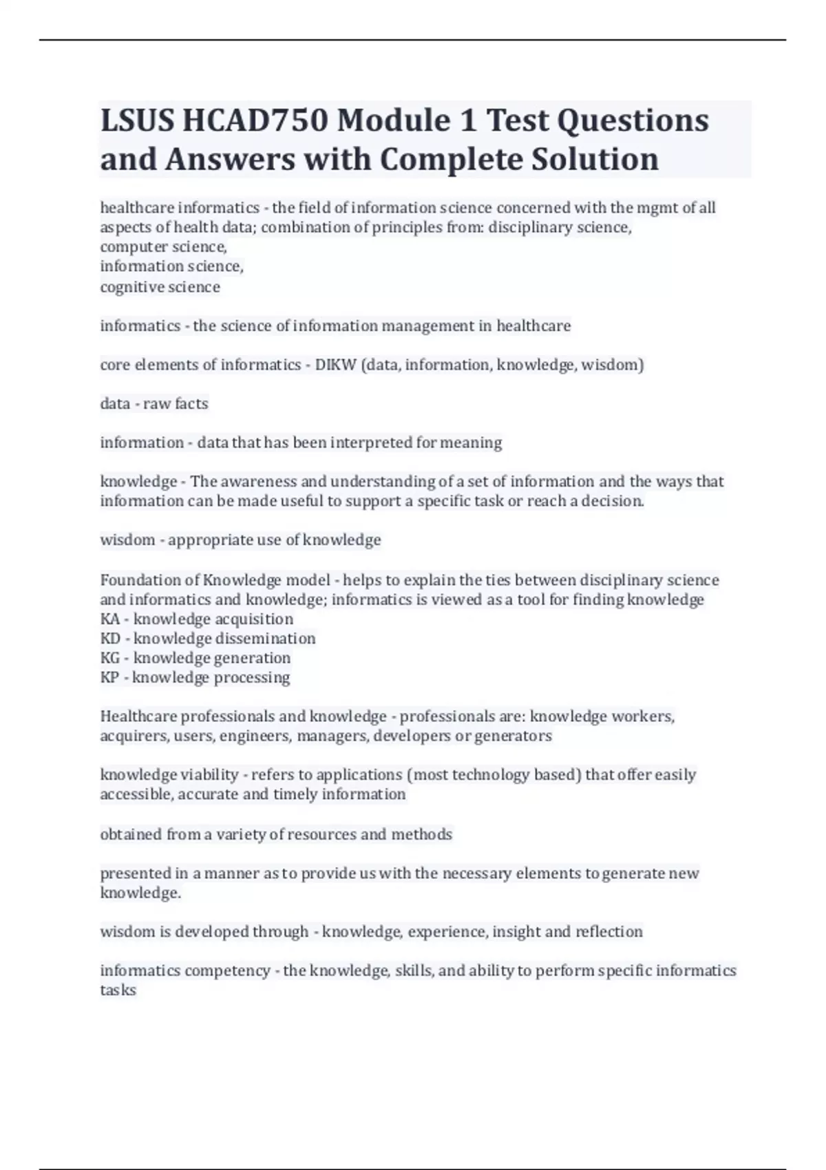 LSUS HCAD750 Module 1 Test Questions and Answers with Complete Solution healthcare informatics - the field of information science concerned with the mgmt of all aspects of health data; combination of principles from: disciplinary science, computer science, information science, cognitive science informatics - the science of information management in healthcare core elements of informatics - DIKW (data, information, knowledge, wisdom) data - raw facts information - data that has been interpreted for meaning knowledge - The awareness and understanding of a set of information and the ways that information can be made useful to support a specific task or reach a decision. wisdom - appropriate use of knowledge Foundation of Knowledge model - helps to explain the ties between disciplinary science and informatics and knowledge; informatics is viewed as a tool for finding knowledge KA - knowledge acquisition KD - knowledge dissemination KG - knowledge generation KP - knowledge processing Healthcare professionals and knowledge - professionals are: knowledge workers, acquirers, users, engineers, managers, developers or generators knowledge viability - refers to applications (most technology based) that offer easily accessible, accurate and timely information obtained from a variety of resources and methods presented in a manner as to provide us with the necessary elements to generate new knowledge. wisdom is developed through - knowledge, experience, insight and reflection informatics competency - the knowledge, skills, and ability to perform specific informatics tasks AHIMA-AMIA task force - 5 domains for all healthcare workers: 1. Health information literacy and skills 2. Health informatics skills using the EHR 3. Privacy and confidentiality of health information 4. Health information/ data technical security 5. Basic computer literacy skills criteria of valuable meaningful information - accessible, accurate, timely, complete, cost effective, flexible, reliable, relevant, simple, verifiable, and secure data integrity - whole, complete, correct, and consistent data compromises data integrity - human error, viruses, worms, other bugs, hardware failures or crashes, transmission errors, and/or hacker entering the system dirty data - errors in the database - duplicate, incomplete, or outdated records characteristics of quality information - accessibility, security, timeliness, accuracy, relevancy, completeness, flexibility, reliability, objectivity, utility, transparency, verifiability, and reproducibility information science - studying the application and usage of information and knowledge; studies everything that deals with information; multidisciplinary science that involves aspects from computer science, cognitive science, social science, communication science, and library science information processing - conversion of latent information (not apparent) into manifest (obvious/clearly apparent) information information system (IS) - a set of hardware, software, data, people, and procedures that work together to collect, create, and distribute useful information; computer-based information systems (CBISs) Systems Development Life Cycle (SDLC) - the traditional process used to develop information systems that fit with the strategic business plan of an organization waterfall model - sequential development process; each phase must be completely finished before the next begins rapid prototyping or rapid application development (RAD) - fast way to add functionality through prototyping and user testing object oriented systems development (OOSD) - approach to systems development that combines the logic of the systems development life cycle with the power of object-oriented modeling and programming dynamic systems development method (DSDM) - highly iterative and incremental approach with a high level of user input and involvement; 3 phases - pre-project, project life cycle (feasibility and business studies, functional model iteration, design and build iteration, implementation), post-project computer-aided software engineering (CASE) tools - Software tools that provide automated support for some portion of the systems development process. Open Source Software (OSS) and Free/OSS - Software that is free and whose code can be accessed and potentially modified by anyone. interoperability - the ability to exchange and use computer information within and across networks; paramount under the HITECH Act Health Information Technology for Economic and Clinical Health (HITECH) - provision of the American Recovery and Reinvestment Act (ARRA) of 2009 to provide reimbursement incentives for eligible professionals and hospitals who are successful in becoming "meaningful users" of certified electronic health record (EHR) technology applied healthcare informatics - emphasizes the use of the computer-based applications in delivering and documenting healthcare services five categories of current and emerging tech in healthcare - 1. capture of various types of data and formats; 2. efficient access to, and flow of, data and information; 3. managerial and clinical decision making; 4. diagnosis, treatment, and care of patients; 5. security of data and information Clinical data repository (CDR) - a component of the EHR that captures data; different data types and formats discrete data - structured data; coded and alphanumeric; fields are predefined and limited; patient lab order/results; searchable free-text data - unstructured data, not predefined or limited, not easily searchable; transcribed radiology/pathology result, history and physical, clinical notes, etc. bit-mapped data - unstructured; diagnostic image data (x-ray or CT scan); each bit is saved raster image - the smallest unit of which is a picture element or pixel; hundreds of pixels simulate the image analog - diagnostic image data on photographic films, must be digitally scanned
