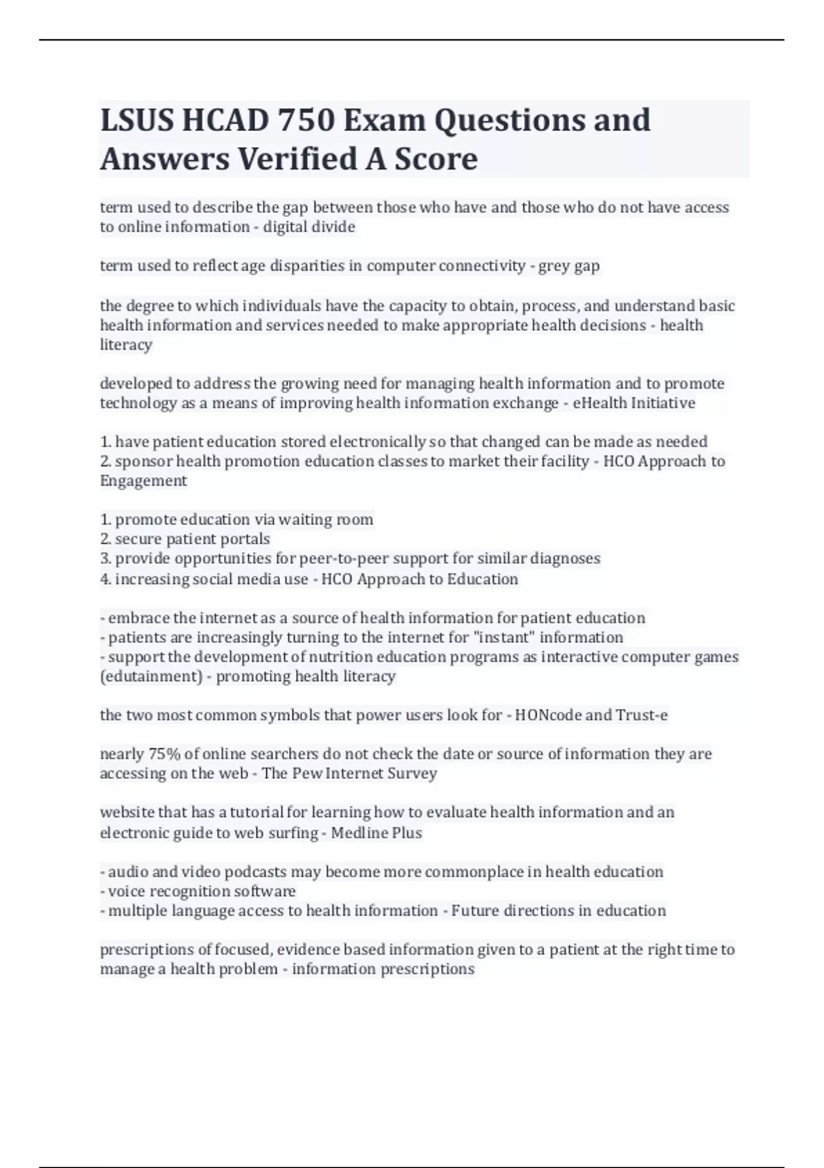 LSUS HCAD 750 Exam Questions and Answers Verified A Score term used to describe the gap between those who have and those who do not have access to online information - digital divide term used to reflect age disparities in computer connectivity - grey gap the degree to which individuals have the capacity to obtain, process, and understand basic health information and services needed to make appropriate health decisions - health literacy developed to address the growing need for managing health information and to promote technology as a means of improving health information exchange - eHealth Initiative 1. have patient education stored electronically so that changed can be made as needed 2. sponsor health promotion education classes to market their facility - HCO Approach to Engagement 1. promote education via waiting room 2. secure patient portals 3. provide opportunities for peer-to-peer support for similar diagnoses 4. increasing social media use - HCO Approach to Education - embrace the internet as a source of health information for patient education - patients are increasingly turning to the internet for "instant" information - support the development of nutrition education programs as interactive computer games (edutainment) - promoting health literacy the two most common symbols that power users look for - HONcode and Trust-e nearly 75% of online searchers do not check the date or source of information they are accessing on the web - The Pew Internet Survey website that has a tutorial for learning how to evaluate health information and an electronic guide to web surfing - Medline Plus - audio and video podcasts may become more commonplace in health education - voice recognition software - multiple language access to health information - Future directions in education prescriptions of focused, evidence based information given to a patient at the right time to manage a health problem - information prescriptions wide range of health services that are delivered by telecommunications-ready tools, such as telephone, videophone, and computer (does not always involve clinical servies) - telehealth -demographics - healthcare worker shortages -chronic conditions - new educated consumers -excessive costs - driving forces for telehealth the use of medical information exchanged from one site to another via electronic communications to improve patients' health status - telemedicine -homebound -limited transportation access -rural or remote populations -reduce hospital length of stay -managing patients in a major disaster - telehealth patient populations 1. central stations/web servers 2. peripheral biometric devices 3. telephones 3. video cameras 4. personal emergency response systems 5. sensor and activity monitoring systems 6. medication management devices - tools of home telehealth