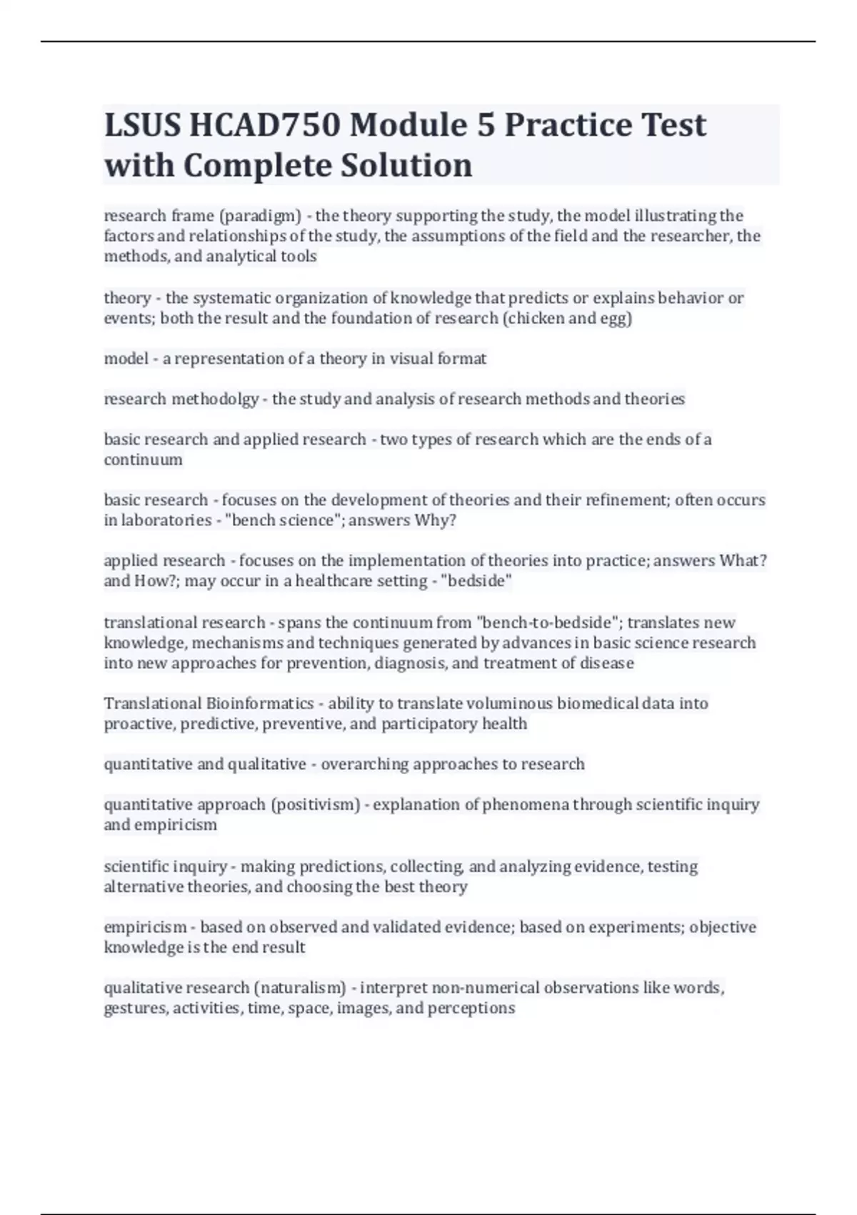 LSUS HCAD750 Module 5 Practice Test with Complete Solution research frame (paradigm) - the theory supporting the study, the model illustrating the factors and relationships of the study, the assumptions of the field and the researcher, the methods, and analytical tools theory - the systematic organization of knowledge that predicts or explains behavior or events; both the result and the foundation of research (chicken and egg) model - a representation of a theory in visual format research methodolgy - the study and analysis of research methods and theories basic research and applied research - two types of research which are the ends of a continuum basic research - focuses on the development of theories and their refinement; often occurs in laboratories - "bench science"; answers Why? applied research - focuses on the implementation of theories into practice; answers What? and How?; may occur in a healthcare setting - "bedside" translational research - spans the continuum from "bench-to-bedside"; translates new knowledge, mechanisms and techniques generated by advances in basic science research into new approaches for prevention, diagnosis, and treatment of disease Translational Bioinformatics - ability to translate voluminous biomedical data into proactive, predictive, preventive, and participatory health quantitative and qualitative - overarching approaches to research quantitative approach (positivism) - explanation of phenomena through scientific inquiry and empiricism scientific inquiry - making predictions, collecting, and analyzing evidence, testing alternative theories, and choosing the best theory empiricism - based on observed and validated evidence; based on experiments; objective knowledge is the end result qualitative research (naturalism) - interpret non-numerical observations like words, gestures, activities, time, space, images, and perceptions mixed methods research - Combines qualitative and quantitative research techniques Inductive reasoning (induction) - drawing conclusions based on a limited number of observations Deductive reasoning (deduction) - drawing conclusions based on generalizations basic components of research - defining the question (problem), performing the literature review determining a research design and methodology selecting an instrument gathering data analyzing the data presenting the results Three sources of meaningful problems - 1. Research models - problematic factors 2. Recommendations of earlier researchers 3. Gaps in the body of knowledge operationalize a research question - formulating the question in terms that are capable of generating data and that satisfactorily capture the issues of the question or problem literature review - a systematic and critical investigation of the important information about a topic; 1. process 2. product - portion of a study's presentation 3. product - entire research article or book primary sources of literature review - the original works of the researchers who conducted the investigation; NEJM New England Journal of Medicine secondary sources of literature review - summaries of the original works; encyclopedias and textbooks peer-reviewed (refereed) journals - the gold standard for a literature review is primary research in ____; also called research, academic, and professional Peer review - the process that ensures that the information reported in the journal is of the highest quality non-peer reviewed - called popular well-developed literature review - concisely and logically states what is known and unknown about a topic systematic literature review - "Methodical approach to literature review that reduces the possibility of bias; characterized by explicit search criteria to identify literature, inclusion and exclusion criteria to select articles and information sources, and evaluation against consistent methodological standards" meta-analysis - a "study of studies" that combines the findings of multiple studies to arrive at a conclusion Six common research designs - 1. Historical 2. Descriptive 3. Correlational 4. Evaluation 5. Experimental 6. Causal-Comparative (Quasi-Experimental) historical research - investigates the past; primary (reports, minutes, letters) and secondary sources descriptive research - determines and reports the current status of topics and subjects through surveys, interviews and observations; has shortcomings - lack of standard questions, etc. correlational research - determines the existence, the direction, and the degree of relationships among factors; cannot establish causation variables - factors in correlational research correlational relationships - positive (direct) relationship or negative (inverse) relationship confounding (extraneous, secondary) variable - a third unlisted factor that confuses interpretation of the data evaluation research - examines the effectiveness and efficiency of programs, organizations, interventions, policies, technologies, or products; AKA outcomes research, health services research, health technology assessment, and comparative effectiveness research (CER); to assess value; case studies outcomes research - studies aimed at assessing the quality and effectiveness of healthcare as measured by the attainment of a specified end result or outcome, improved health, lowered morbidity or mortality health services research - research that integrates "epidemiologic, sociological, economic, and other analytic sciences in the study of health services"; concerned with the relationships between need, demand, supply, use, and outcome of health services health technology assessment - evaluation of the usefulness (utility) of health technologies comparative effectiveness research (CER) - Research that generates and synthesizes evidence that compares the benefits and harms of alternative methods to prevent, diagnose, treat, and monitor a clinical condition, or to improve the delivery of care