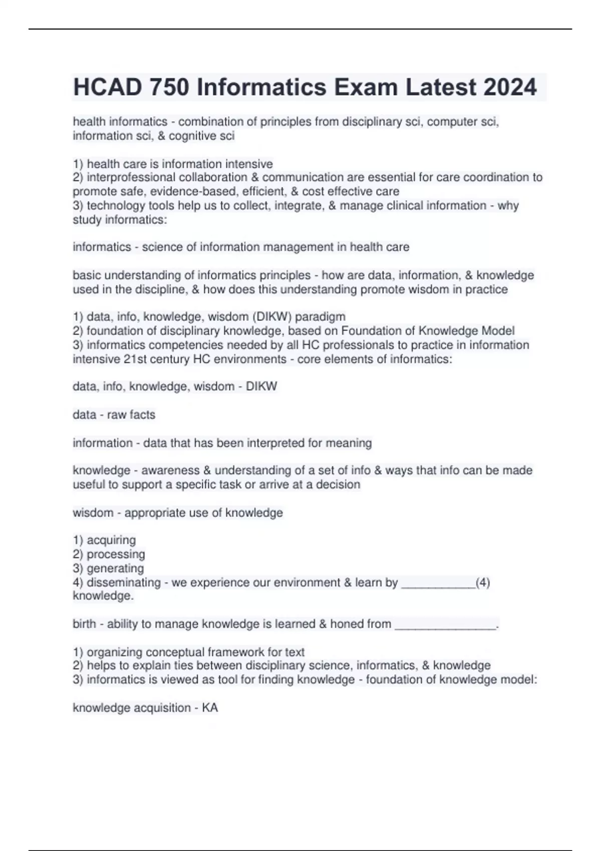 HCAD 750 Informatics Exam Latest 2024 health informatics - combination of principles from disciplinary sci, computer sci, information sci, & cognitive sci 1) health care is information intensive 2) interprofessional collaboration & communication are essential for care coordination to promote safe, evidence-based, efficient, & cost effective care 3) technology tools help us to collect, integrate, & manage clinical information - why study informatics: informatics - science of information management in health care basic understanding of informatics principles - how are data, information, & knowledge used in the discipline, & how does this understanding promote wisdom in practice 1) data, info, knowledge, wisdom (DIKW) paradigm 2) foundation of disciplinary knowledge, based on Foundation of Knowledge Model 3) informatics competencies needed by all HC professionals to practice in information intensive 21st century HC environments - core elements of informatics: data, info, knowledge, wisdom - DIKW data - raw facts information - data that has been interpreted for meaning knowledge - awareness & understanding of a set of info & ways that info can be made useful to support a specific task or arrive at a decision wisdom - appropriate use of knowledge 1) acquiring 2) processing 3) generating 4) disseminating - we experience our environment & learn by ___________(4) knowledge. birth - ability to manage knowledge is learned & honed from _______________. 1) organizing conceptual framework for text 2) helps to explain ties between disciplinary science, informatics, & knowledge 3) informatics is viewed as tool for finding knowledge - foundation of knowledge model: knowledge acquisition - KA knowledge dissemination - KD knowledge generation - KG knowledge processing - KP 1) professionals are knowledge workers (work with info & knowledge as product) 2) professionals are knowledge acquirers (provide convenient & efficient means of capturing & storing knowledge) 3) are knowledge users (indiv/groups who benefit from valuable, viable knowledge) 4) professionals are knowledge engineers (design, develop, implement, & maintain knowledge) - healthcare professionals & knowledge: 1) HC professionals are knowledge managers (capture & process collective expertise & distribute it where it can create the largest benefit) 2) HC professionals are knowledge developers or generators (changing & evolving knowledge based on tasks at hand & information available) - disciplinary science & knowledge: knowledge viability - refers to technology based applications that offer easily accessible, accurate, & timely info obtained from variety of resources & methods & presented in a manner that provides us with necessary elements to generate new knowledge wisdom - the application of knowledge to an appropriate situation; uses knowledge & experience to heighten common sense & insight in order to exercise sound judgement in practical matters; developed through knowledge, experience, insight, & reflection wisdom - in the practice of healthcare science, we expect action(s) to be directed by __________________