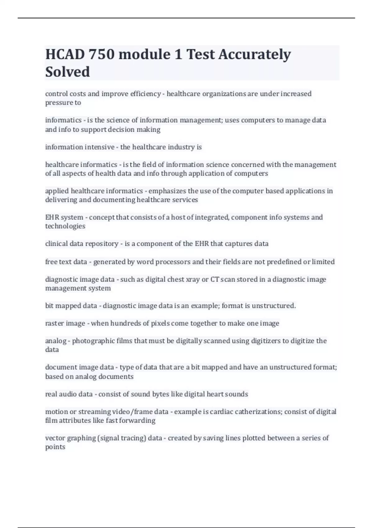 HCAD 750 module 1 Test Accurately Solved control costs and improve efficiency - healthcare organizations are under increased pressure to informatics - is the science of information management; uses computers to manage data and info to support decision making information intensive - the healthcare industry is healthcare informatics - is the field of information science concerned with the management of all aspects of health data and info through application of computers applied healthcare informatics - emphasizes the use of the computer based applications in delivering and documenting healthcare services EHR system - concept that consists of a host of integrated, component info systems and technologies clinical data repository - is a component of the EHR that captures data free text data - generated by word processors and their fields are not predefined or limited diagnostic image data - such as digital chest xray or CT scan stored in a diagnostic image management system bit mapped data - diagnostic image data is an example; format is unstructured. raster image - when hundreds of pixels come together to make one image analog - photographic films that must be digitally scanned using digitizers to digitize the data document image data - type of data that are a bit mapped and have an unstructured format; based on analog documents real audio data - consist of sound bytes like digital heart sounds motion or streaming video/frame data - example is cardiac catherizations; consist of digital film attributes like fast forwarding vector graphing (signal tracing) data - created by saving lines plotted between a series of points multimedia - when more than one unstructured data type is present in an information system the data and system they represent are referred to as speech recognition technology - is speaker independent with continuous speech input continuous speech input - does not require the user to pause between words to let the computer distinguish between beginning and ending of words natural language processing technology - considers sentence structure, meaning, and context to accurately process and extract free-text data meanings - natural language processing technology knows the difference in the narratives autocoding and computer assited coding - what are the terms commonly used to describe natural language processing technology's method of extracting and translating dictated and transcribed free text data text mining - commonly used to describe the process of extracting and then quantifying and filtering free text data and discrete data document - any analog or digital formatted and preservered container of data or info collectively referred to as content electronic document/content management system (ED/CM) - any electronic system that manages an organizations analog and digital documents and content document imaging technology - one of many ED/CM system component technologies; electronically captures, stores, identifies, retrieves, and distributes documents that are not generated digitally but are stored on paper for distribution puposes document management technology - automatically organizes assembles secures and shares documents electronic records management technology - includes components that must ensure the authenticity, security, and reliability of an organization's electronic records. business process management technology - allows computers to add and extract value from document content as the documents move through an organization workflow technology - in healthcare, automatically routes electronic documents into electronic in baskets of its department clerks for disposition decisions computer output laser disk/enterprise report management technology - electronically stores, manages, and distributes documents that are generated in a digital format and whose output data are report formatted and print stream originated automated forms processing technology - allows users to electronically enter data into online forms and electronically extract the data from the online forms for various data manipulation purposes digital signature management technology - offers both signer and document authentication for analog or digital documents diagnostic imaging technology - medical imaging that consists of using tools to capture images of the human body and used for clinical decision making picture archiving and communication systems (PACS) - images taken from multiple sources are archived electronically automatic recognition technologies - used to recognize analog items automatically character and symbol recognition technologies - include barcoding, optical character recognition and gesture recognition technologies bar coding technology - standardized in HC; used for labels, wristbands, specimen containers, etc HCAD 750 module 1 Test Accurately Solved control costs and improve efficiency - healthcare organizations are under increased pressure to informatics - is the science of information management; uses computers to manage data and info to support decision making information intensive - the healthcare industry is healthcare informatics - is the field of information science concerned with the management of all aspects of health data and info through application of computers applied healthcare informatics - emphasizes the use of the computer based applications in delivering and documenting healthcare services EHR system - concept that consists of a host of integrated, component info systems and technologies clinical data repository - is a component of the EHR that captures data free text data - generated by word processors and their fields are not predefined or limited diagnostic image data - such as digital chest xray or CT scan stored in a diagnostic image management system bit mapped data - diagnostic image data is an example; format is unstructured. raster image - when hundreds of pixels come together to make one image analog - photographic films that must be digitally scanned usin