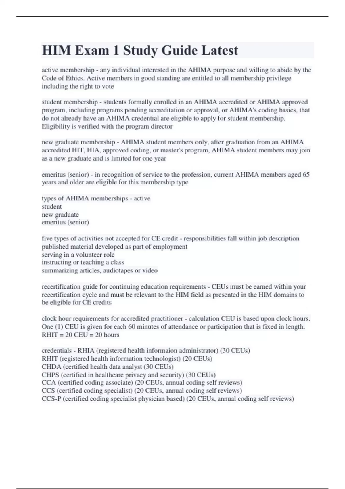 HIM Exam 1 Study Guide Latest active membership - any individual interested in the AHIMA purpose and willing to abide by the Code of Ethics. Active members in good standing are entitled to all membership privilege including the right to vote student membership - students formally enrolled in an AHIMA accredited or AHIMA approved program, including programs pending accreditation or approval, or AHIMA's coding basics, that do not already have an AHIMA credential are eligible to apply for student membership. Eligibility is verified with the program director new graduate membership - AHIMA student members only, after graduation from an AHIMA accredited HIT, HIA, approved coding, or master's program, AHIMA student members may join as a new graduate and is limited for one year emeritus (senior) - in recognition of service to the profession, current AHIMA members aged 65 years and older are eligible for this membership type types of AHIMA memberships - active student new graduate emeritus (senior) five types of activities not accepted for CE credit - responsibilities fall within job description published material developed as part of employment serving in a volunteer role instructing or teaching a class summarizing articles, audiotapes or video recertification guide for continuing education requirements - CEUs must be earned within your recertification cycle and must be relevant to the HIM field as presented in the HIM domains to be eligible for CE credits clock hour requirements for accredited practitioner - calculation CEU is based upon clock hours. One (1) CEU is given for each 60 minutes of attendance or participation that is fixed in length. RHIT = 20 CEU = 20 hours credentials - RHIA (registered health informaion administrator) (30 CEUs) RHIT (registered health information technologist) (20 CEUs) CHDA (certified health data analyst (30 CEUs) CHPS (certified in healthcare privacy and security) (30 CEUs) CCA (certified coding associate) (20 CEUs, annual coding self reviews) CCS (certified coding specialist) (20 CEUs, annual coding self reviews) CCS-P (certified coding specialist physician based) (20 CEUs, annual coding self reviews) CE cycle begins for recently accredited candidates - January 1, and ends on December 31, of the following year method of reporting CE activities - to recertify you can report your CEWs and pay the recertification fee online at AHIMA.ORG/certification or by mail five types of activities accepted for CE credit - participation in educational programs on topics relevant to HIM participation in formal programs of study publication and presentation of material relevant to HIM independent study item writing code of ethics - "the standards of conduct which indicate how we should act or decide based on duties and principles derived from core values" Guides the practice of people who choose a givenprofession and sets forth the values and principles defined by the profession as acceptable behavior within a practice setting non ethical - assigning codes without physician documentation (ethical or non ethical) non ethical - coding when documentation does not justify the procedures that have been billed (ethical or non ethical) non ethical - violating the privacy of individuals (ethical or non ethical) non ethical - allowing inapproprate access to genetic, adoption, or behavioral health information (ethical or non ethical) non ethical - hiding or ignoring review outcomes, such as performance data (ethical or non ethical) non ethical - engaging in negligent coding practices (ethical or non ethical) non ethical - allowing patterns of retrospective documentation ot avoid suspension or increase reimbursement (ethical or non ethical) ethical - advocate, uphold and defend the individual's right to privacy and the doctrine of confidentiality in the use and disclosure of information (ethical or non ethical) ethical - put service and the health and welfare of persons before self interest and conduct themselves in the practice of the profession so as to bring honor to themselves, their peers and to the health information management profession (ethical or non ethical) ethical - preserve, protect and secure personal health information in any form or medium and holding the highest regard the contents of the records and other information of a confidential nature, taking into account the applicable statues and regulations (ethical or non ethical) ethical - refuse to participate in or conceal unethical practices or procedures (ethical or non ethical)