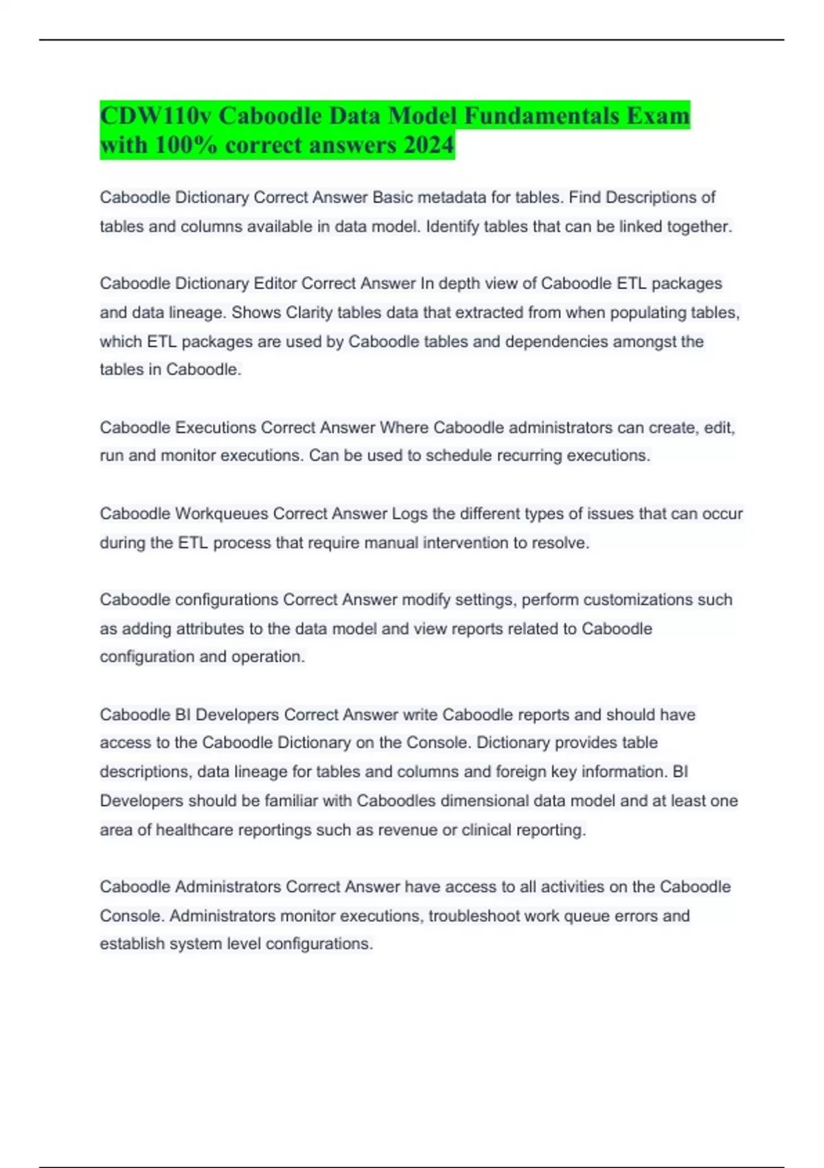 CDW110v Caboodle Data Model Fundamentals Exam with 100% correct answers 2024 Caboodle Dictionary Correct Answer Basic metadata for tables. Find Descriptions of tables and columns available in data model. Identify tables that can be linked together. Caboodle Dictionary Editor Correct Answer In depth view of Caboodle ETL packages and data lineage. Shows Clarity tables data that extracted from when populating tables, which ETL packages are used by Caboodle tables and dependencies amongst the tables in Caboodle. Caboodle Executions Correct Answer Where Caboodle administrators can create, edit, run and monitor executions. Can be used to schedule recurring executions. Caboodle Workqueues Correct Answer Logs the different types of issues that can occur during the ETL process that require manual intervention to resolve. Caboodle configurations Correct Answer modify settings, perform customizations such as adding attributes to the data model and view reports related to Caboodle configuration and operation. Caboodle BI Developers Correct Answer write Caboodle reports and should have access to the Caboodle Dictionary on the Console. Dictionary provides table descriptions, data lineage for tables and columns and foreign key information. BI Developers should be familiar with Caboodles dimensional data model and at least one area of healthcare reportings such as revenue or clinical reporting. Caboodle Administrators Correct Answer have access to all activities on the Caboodle Console. Administrators monitor executions, troubleshoot work queue errors and establish system level configurations. Caboodle ETL Developers Correct Answer create custom EPIC and n on Epic content for extraction into the data warehouse, document their work in the dictionary editor and