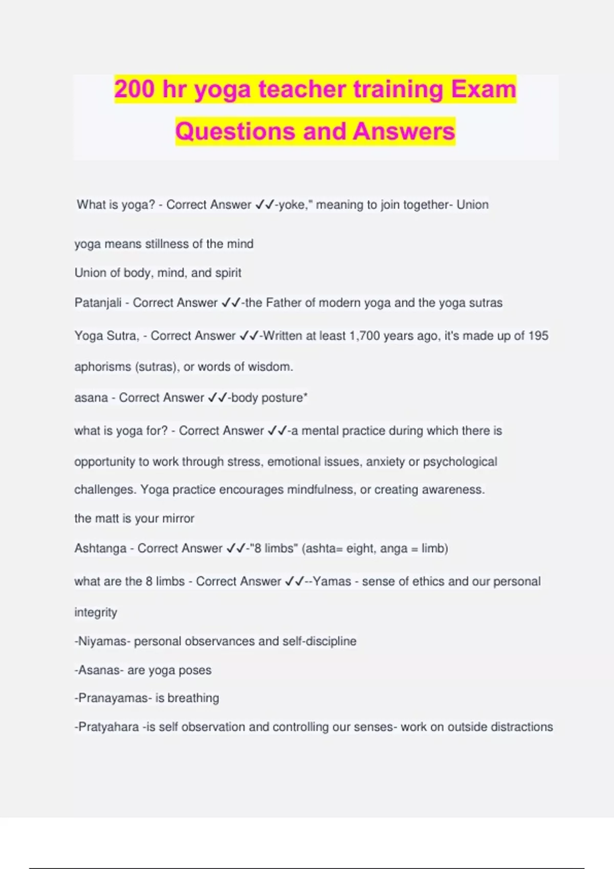 200 hr yoga teacher training Exam Questions and Answers What is yoga? - Correct Answer ️️ -yoke," meaning to join together- Union yoga means stillness of the mind Union of body, mind, and spirit Patanjali - Correct Answer ️️ -the Father of modern yoga and the yoga sutras Yoga Sutra, - Correct Answer ️️ -Written at least 1,700 years ago, it's made up of 195 aphorisms (sutras), or words of wisdom. asana - Correct Answer ️️ -body posture* what is yoga for? - Correct Answer ️️ -a mental practice during which there is opportunity to work through stress, emotional issues, anxiety or psychological challenges. Yoga practice encourages mindfulness, or creating awareness. the matt is your mirror Ashtanga - Correct Answer ️️ -"8 limbs" (ashta= eight, anga = limb) what are the 8 limbs - Correct Answer ️️ --Yamas - sense of ethics and our personal integrity -Niyamas- personal observances and self-discipline -Asanas- are yoga poses -Pranayamas- is breathing -Pratyahara -is self observation and controlling our senses- work on outside distractions -Dharana- is concentration- inside distractions- focus on one point -Dhyana- is meditation- stillness of the mind -Samadhi- to stand outside of what are the five rules to Yamas - Correct Answer ️️ --the golden rule/ how we react to others -Ahimsa- practice of non-violence/non harming others and the self -Satya- is the practice of truthfulness -Asteya - practice of non-stealing -Brahmacharya- is moderation, or the proper use of energy Aparigraha- is practicing non-attachment/ appreciating because it can be fleeting what are the five niyamas - Correct Answer ️️ --how we react to ourself/help ourselves. -Saucha- is the practice of purification/ cleansing -Santosha- is the practice of contentment -Tapas- practicing discipline and austerity -Svadhyaya-is the practice of self study/ alone time -Ishvara Pranidhana- is devotion, dedication and surrender to the Highest Love karma yoga - Correct Answer ️️ -To do this, we have to take the benefits we receive from our practice and give them as an offering. we experience a connection with a power greater than ourselves. This is the oneness, the surrender, that is Ishvara Pranidhana. examples: community classes,charity benefits or some other form of giving or donation Purusharthas (for purpose of the soul): 4 Aims of Life - Correct Answer ️️ --they build on one another AND balance and theme a yoga class with this!!!!!!!!!!!!!!!!!!!!!! -Moksha- full liberation (be yourself, calm in the storm) -Dharma- essentially means duty (talents, born into, title, responsibilities you choose ie. like a dog) -Artha- is prosperity (how to carry out your dharama) - Kama- is pleasure find balance between the 4 aims of life 4 Noble truths - Correct Answer ️️ --Dukkha, which means that life is suffering. -Samudaya, that we create our own suffering in our minds. -Nirodha, the end of suffering, which means the end of wanting, craving or desiring. -Marga, -which is the 8-fold path that leads to the cessation of suffering. 4 Aspects of True Love: - Correct Answer ️️ -- Maitri-It is benevolence or loving kindness -karuna- which means compassion -mudita- which means joy -Upekesha- which means freedom or equanimity Bhagavad Gita - Correct Answer ️️ --The Bhagavad Gita, often known simply as the "Gita" - There are 700 different verses -all written in 300-400 BCE -part of the epic Indian text, the Mahabharata. -ongoing dialogue between Prince Arjuna and Sri Krishna -the three-fold path of yoga- karma (behavior), jnana (knowledge), and bhakti (devotion) -it gives way to talks about the purpose of life, the three-fold path of yoga, and the essence of the soul-