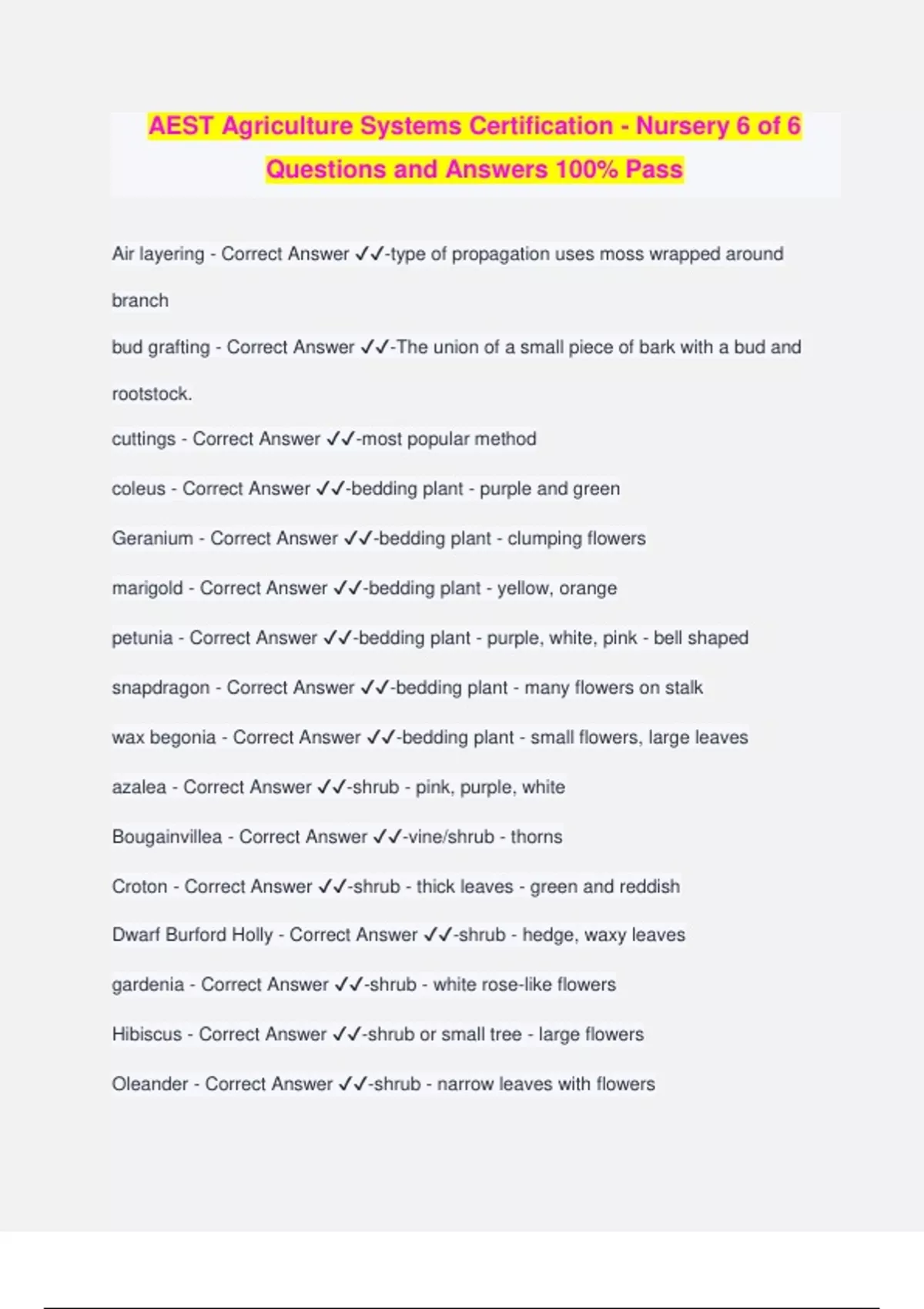 AEST Agriculture Systems Certification - Nursery 6 of 6 Questions and Answers 100% Pass Air layering - Correct Answer ️️ -type of propagation uses moss wrapped around branch bud grafting - Correct Answer ️️ -The union of a small piece of bark with a bud and rootstock. cuttings - Correct Answer ️️ -most popular method coleus - Correct Answer ️️ -bedding plant - purple and green Geranium - Correct Answer ️️ -bedding plant - clumping flowers marigold - Correct Answer ️️ -bedding plant - yellow, orange petunia - Correct Answer ️️ -bedding plant - purple, white, pink - bell shaped snapdragon - Correct Answer ️️ -bedding plant - many flowers on stalk wax begonia - Correct Answer ️️ -bedding plant - small flowers, large leaves azalea - Correct Answer ️️ -shrub - pink, purple, white Bougainvillea - Correct Answer ️️ -vine/shrub - thorns Croton - Correct Answer ️️ -shrub - thick leaves - green and reddish Dwarf Burford Holly - Correct Answer ️️ -shrub - hedge, waxy leaves gardenia - Correct Answer ️️ -shrub - white rose-like flowers Hibiscus - Correct Answer ️️ -shrub or small tree - large flowers Oleander - Correct Answer ️️ -shrub - narrow leaves with flowers