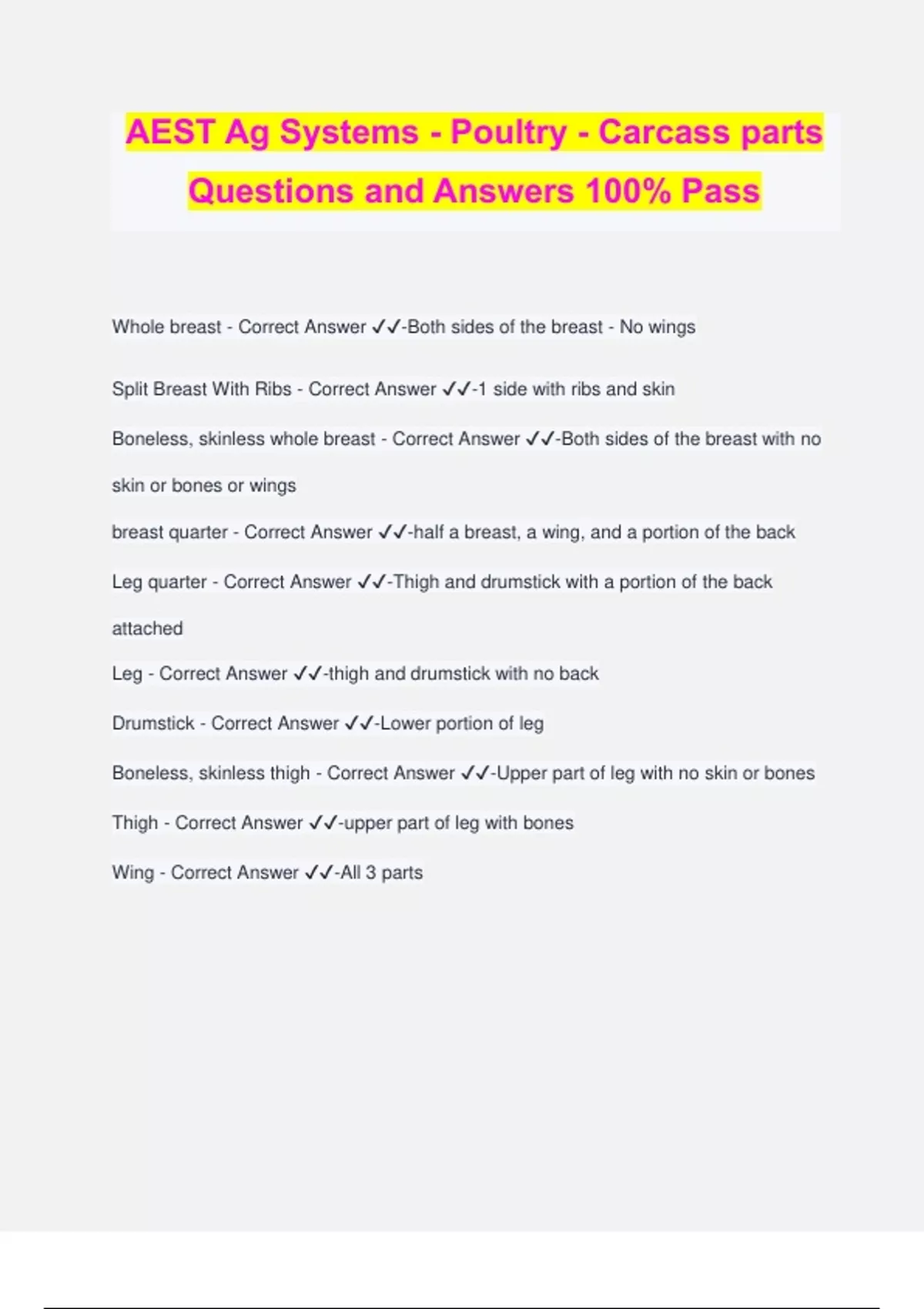 AEST Ag Systems - Poultry - Carcass parts Questions and Answers 100% Pass