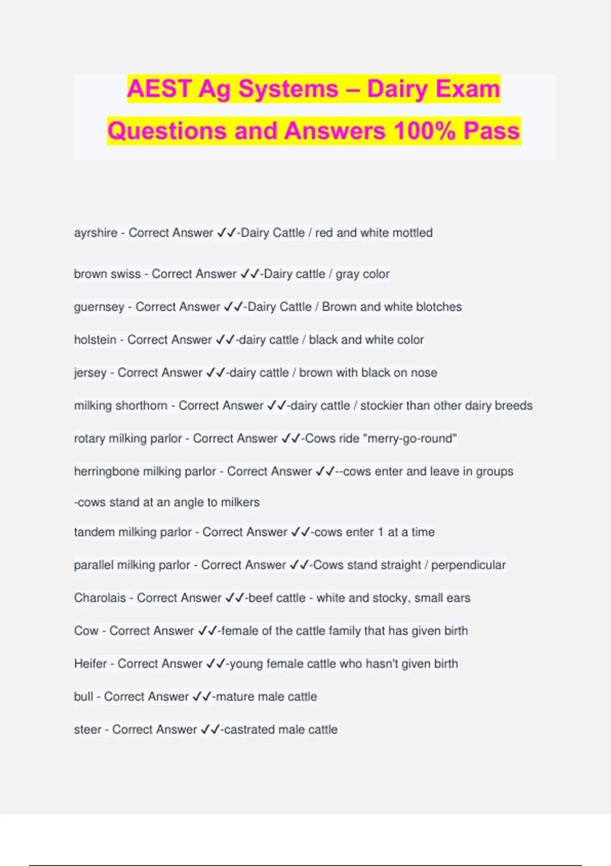 AEST Ag Systems – Dairy Exam Questions and Answers 100% Pass ayrshire - Correct Answer ️️ -Dairy Cattle / red and white mottled brown swiss - Correct Answer ️️ -Dairy cattle / gray color guernsey - Correct Answer ️️ -Dairy Cattle / Brown and white blotches holstein - Correct Answer ️️ -dairy cattle / black and white color jersey - Correct Answer ️️ -dairy cattle / brown with black on nose milking shorthorn - Correct Answer ️️ -dairy cattle / stockier than other dairy breeds rotary milking parlor - Correct Answer ️️ -Cows ride "merry-go-round" herringbone milking parlor - Correct Answer ️️ --cows enter and leave in groups -cows stand at an angle to milkers tandem milking parlor - Correct Answer ️️ -cows enter 1 at a time parallel milking parlor - Correct Answer ️️ -Cows stand straight / perpendicular Charolais - Correct Answer ️️ -beef cattle - white and stocky, small ears Cow - Correct Answer ️️ -female of the cattle family that has given birth Heifer - Correct Answer ️️ -young female cattle who hasn't given birth bull - Correct Answer ️️ -mature male cattle