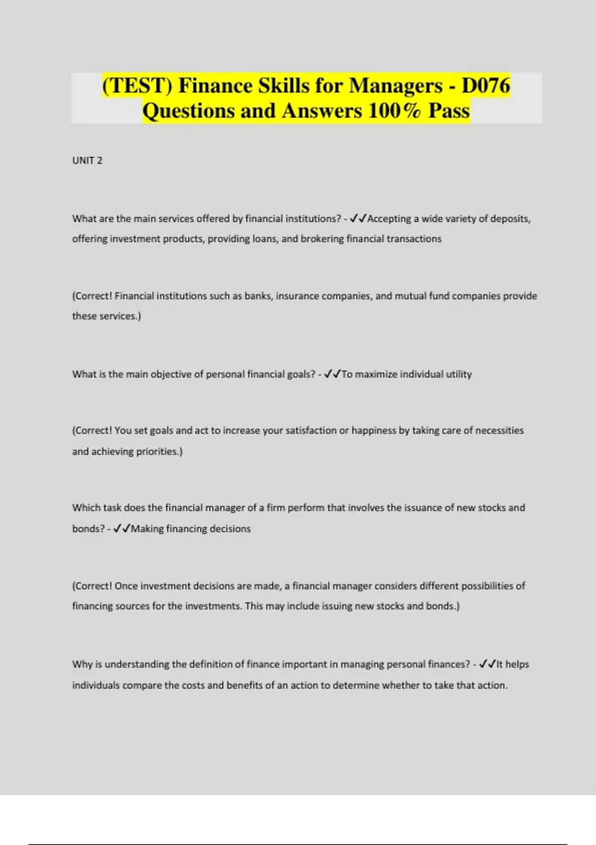 (TEST) Finance Skills for Managers - D076 Questions and Answers 100% Pass